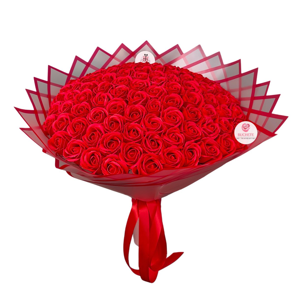 Fiecare trandafir este lucrat cu atentie la detalii, cu petale bine conturate si un finisaj care pastreaza un aspect ingrijit in timp. Nuanta rosie este aleasa pentru un impact vizual clasic, iar parfumul este discret, potrivit pentru a completa experienta fara a domina incaperea. Continutul este clar: un buchet format din 101 trandafiri de sapun rosii, aranjati uniform pentru volum si simetrie. Produsul este considerat fragil si ajunge ambalat pentru transport, protejat in cutie de curierat si pregatit astfel incat sa se mentina forma la livrare; un cadou tip decor care se vede impecabil si dupa despachetare.