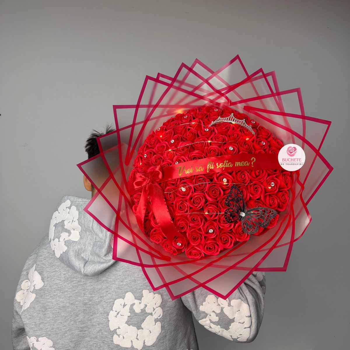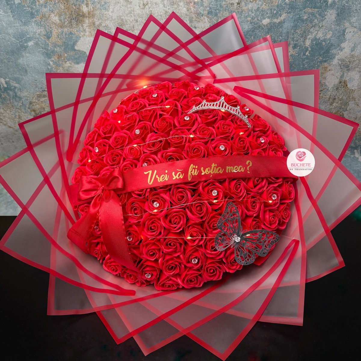 Trandafirii din sapun sunt atent finisati pentru un aspect realist, cu petale bine conturate si un aranjament dens, care ofera volum si prezenta. Compozitia include 101 trandafiri rosii din sapun, o panglica personalizata cu mesajul Vrei sa fii sotia mea?, luminite pentru ambient, coronita pentru accent elegant si un fluturas decorativ care completeaza povestea vizuala. Produsul este fragil si ajunge impachetat pentru transport, in cutie de curierat, protejat astfel incat aranjamentul sa ajunga in siguranta si sa arate ca in fotografii, ideal pentru un decor care se pastreaza.