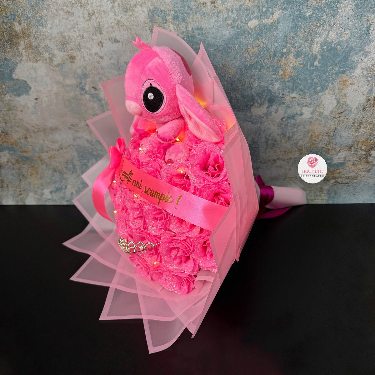 Buchet cu Stitch Roz cu sclipici pentru zi de nastere, coronita si luminite cadou, 29 fire
