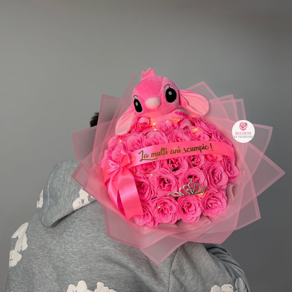 Cand vrei un cadou care sa se vada, sa se pastreze si sa spuna „m-am gandit la tine”, un buchet clasic poate fi frumos, dar trece repede. Acest aranjament ramane impecabil mult timp, iar luminitele adauga o atmosfera calda pentru serile in care aniversata isi aminteste de moment. Cu Stitch Roz si un discret spirit de Ohana, surpriza devine si decor, si amintire, fara grija ofilirii sau a petalelor cazute.