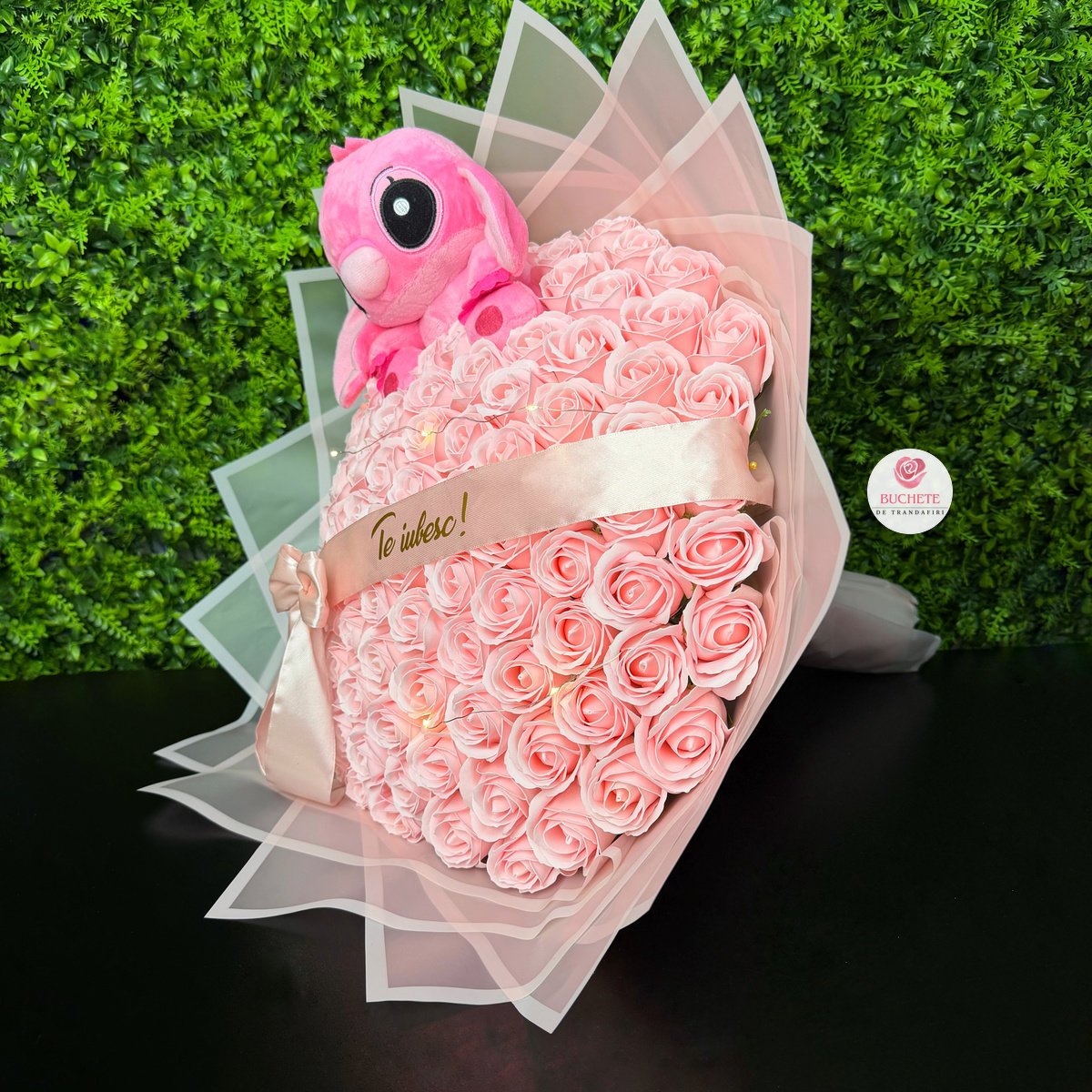 Buchet de flori cu Stitch Roz, 101 Trandafiri de sapun, mesaj si luminite