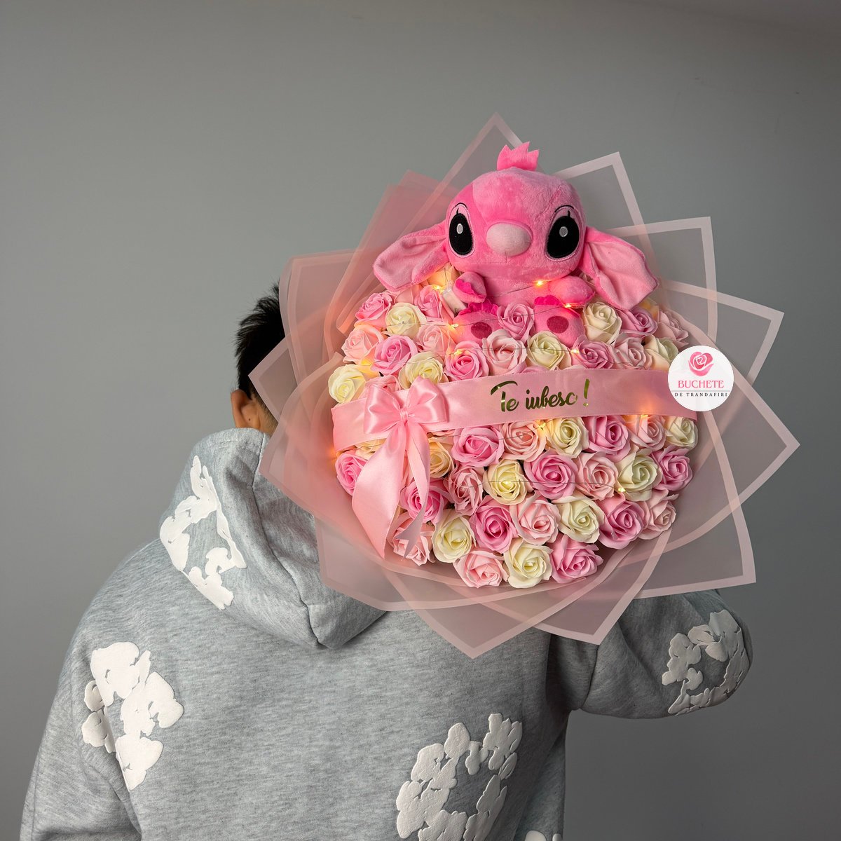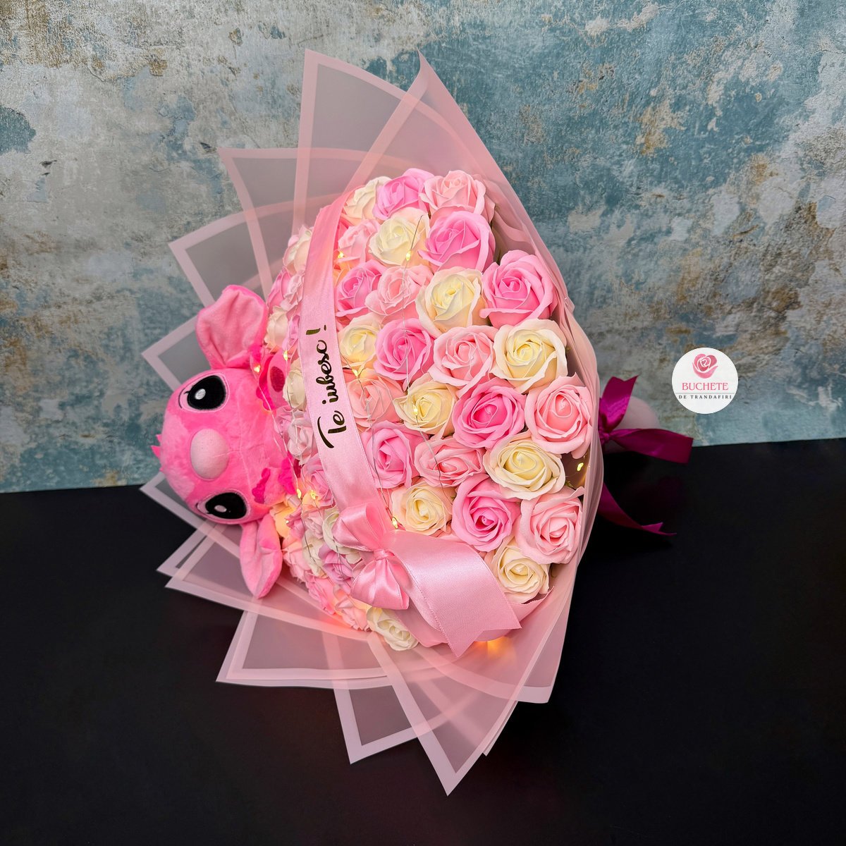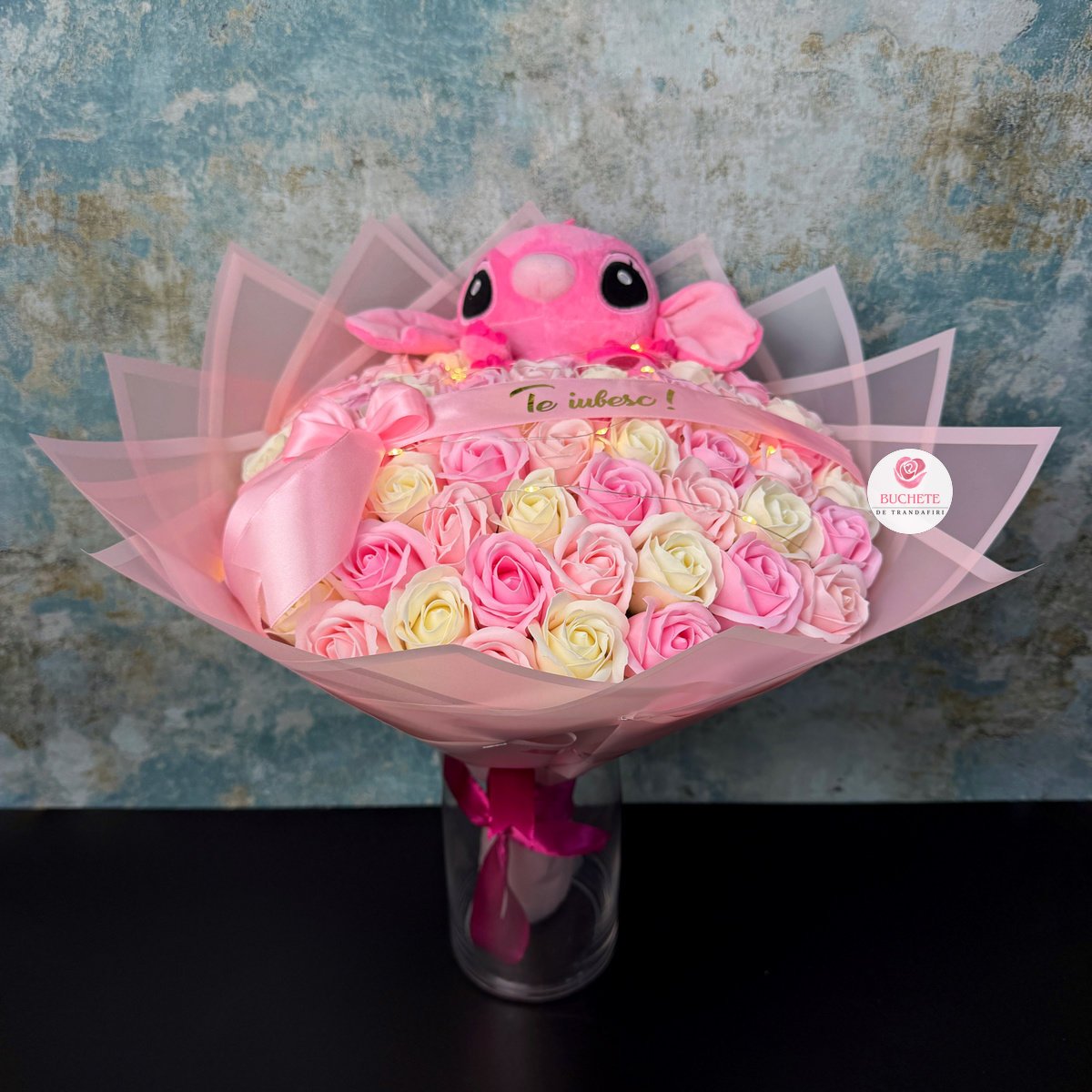 Trandafirii de sapun sunt alesi pentru un aspect apropiat de petalele reale, cu finisaj atent si volum uniform, astfel incat buchetul arata echilibrat din orice unghi. Compozitia include 61 trandafiri de sapun, un Stitch roz integrat in aranjament, o panglica cu mesaj Te iubesc! si luminite pentru un plus de ambient. Acest tip de cadou ramane placut la vedere in timp, fara sa-si piarda forma prin deshidratare ca florile naturale. Produsul este fragil si ajunge impachetat pentru transport, in cutie de curierat, protejat pentru a-si pastra forma la livrare.