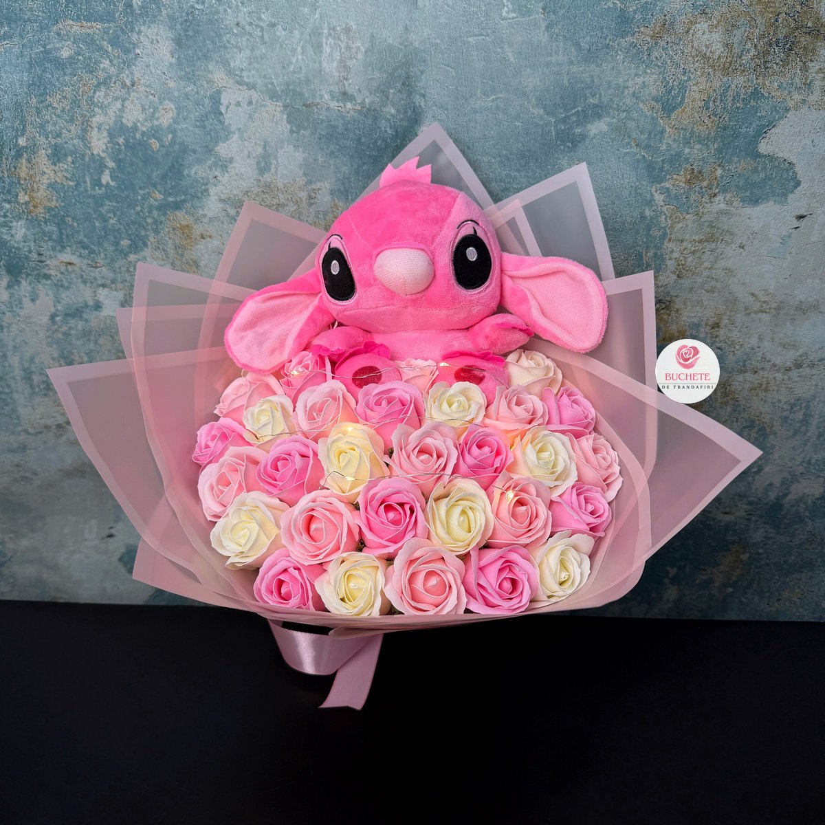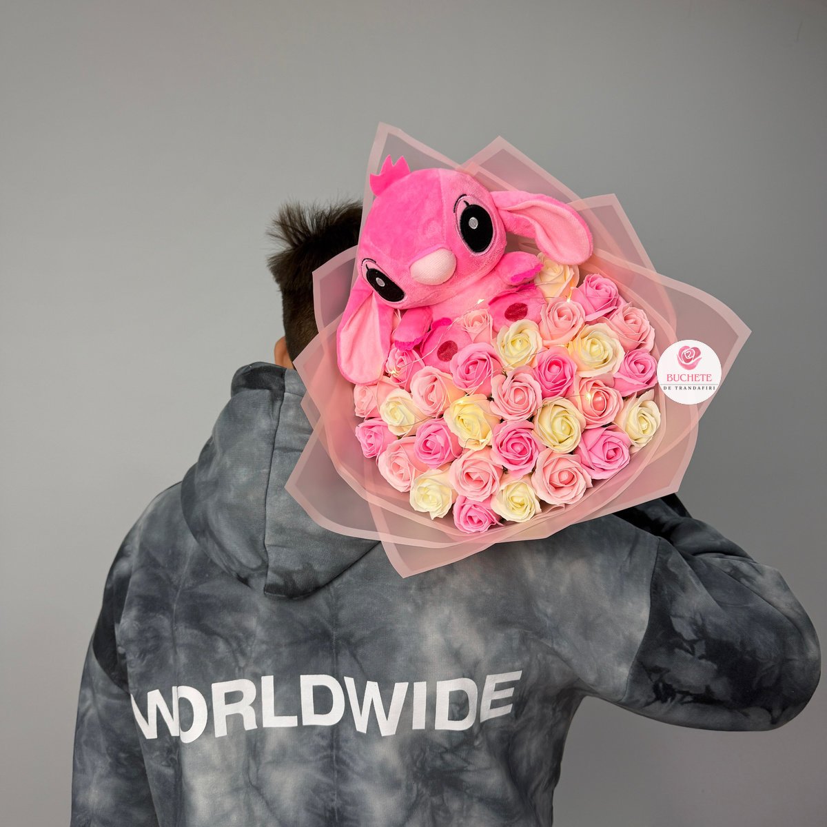 Trandafirii de sapun sunt atent finisati pentru un aspect uniform, petale bine conturate si o prezenta placuta in orice incapere. Textura lor pastreaza forma buchetului, iar nuanta roz este aleasa pentru un look delicat, potrivit atat in decoruri moderne, cat si clasice. Compozitia contine 31 trandafiri de sapun si un element Stitch integrat in aranjament, completat de luminite pentru un ambient cald. Este un cadou cu stitch care se vede bine in poze si ramane la fel de prezentabil in timp. Produsul este fragil si ajunge impachetat pentru transport, in cutie de curierat, protejat corespunzator pentru livrare in siguranta.