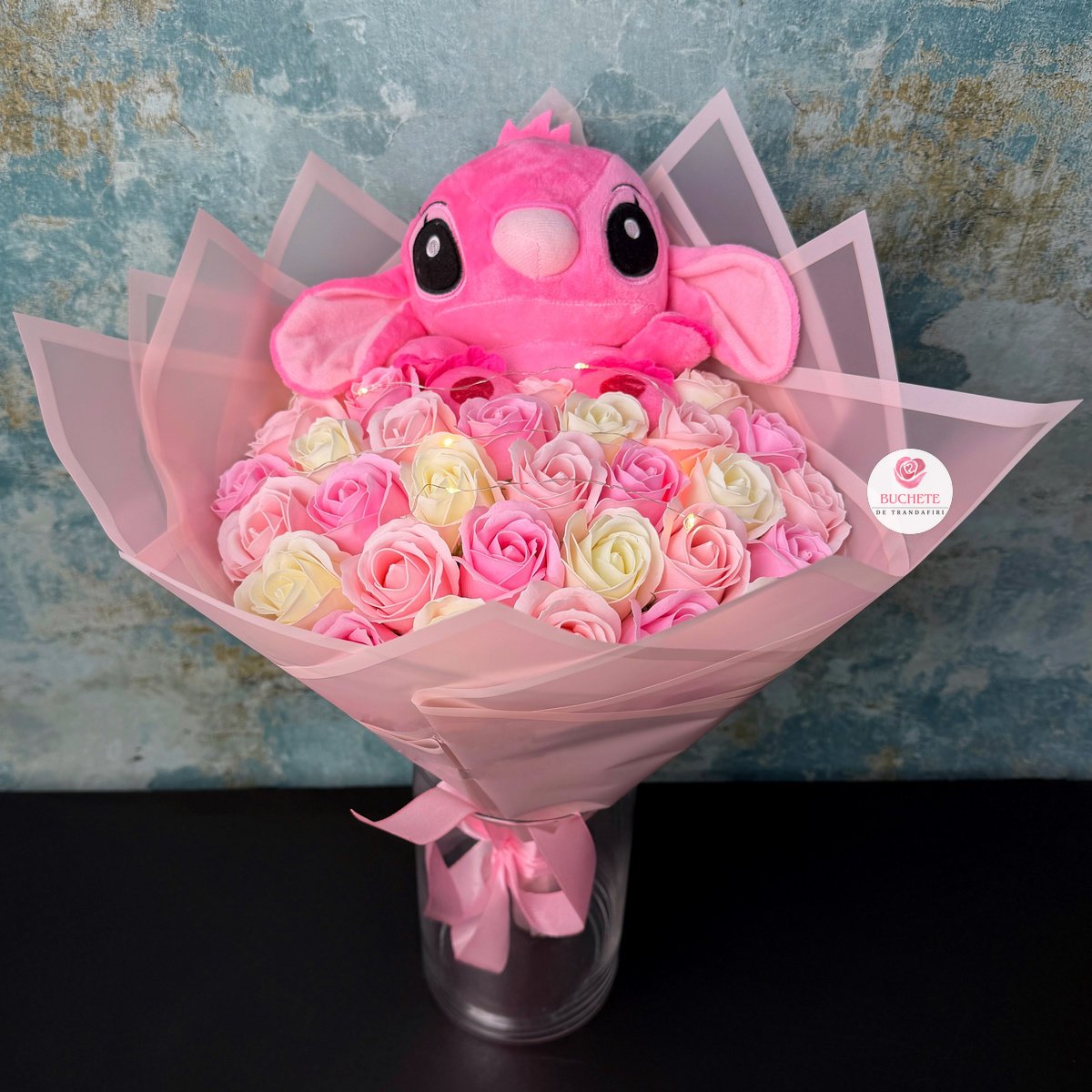 Buchet de flori Stitch Roz din 31 trandafiri de sapun cu luminite cadou
