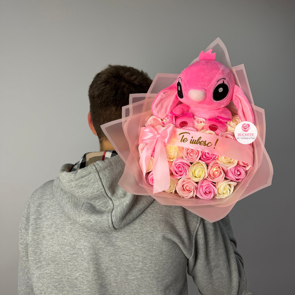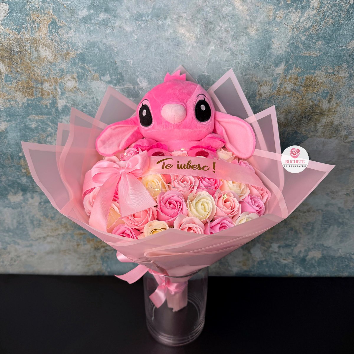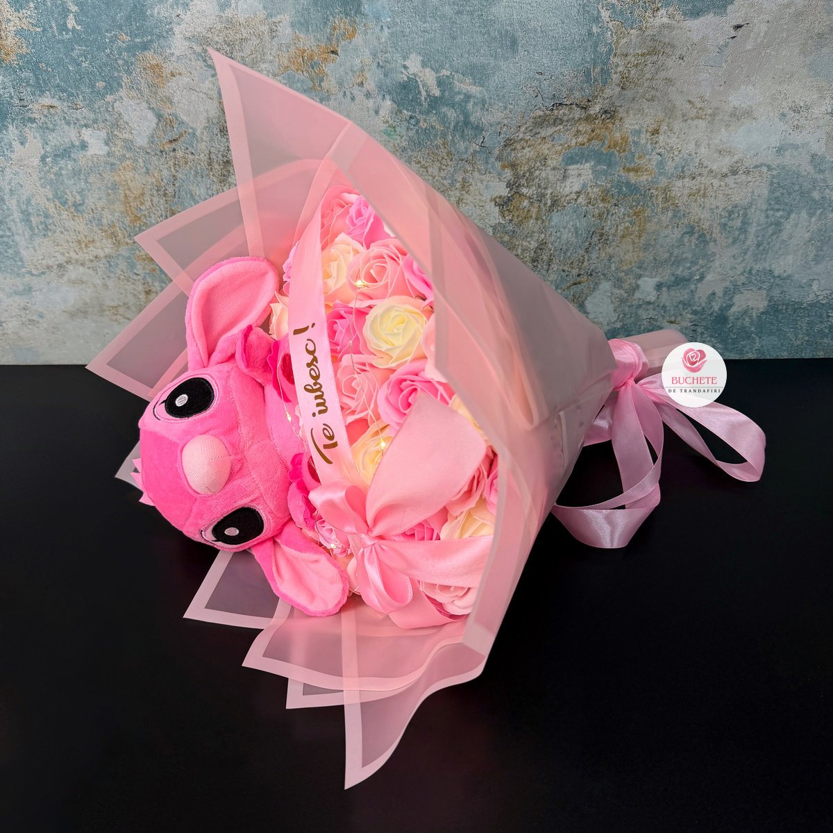 Buchet de Trandafiri cu Stitch Roz si mesaj „Te iubesc”, luminite cadou, 31 trandafiri de sapun