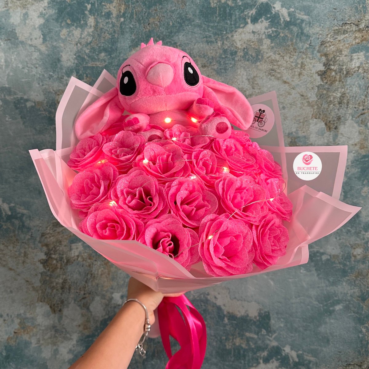 Trandafirii de sapun sunt realizati pentru a reproduce aspectul petalelor, cu textura fina si o forma care isi mentine eleganta in timp, atunci cand sunt pastrati corect. In acest aranjament vei primi 19 trandafiri imperiali in nuante roz, plus Stitch roz fixat in compozitie si luminite care contureaza buchetul intr-un ambient cald. Produsul este fragil si ajunge in siguranta, impachetat atent pentru transport, astfel incat sa arate la fel de bine ca in poze la deschidere. Buchet flori stitch este un decor romantic potrivit atat pentru acasa, cat si pentru birou.