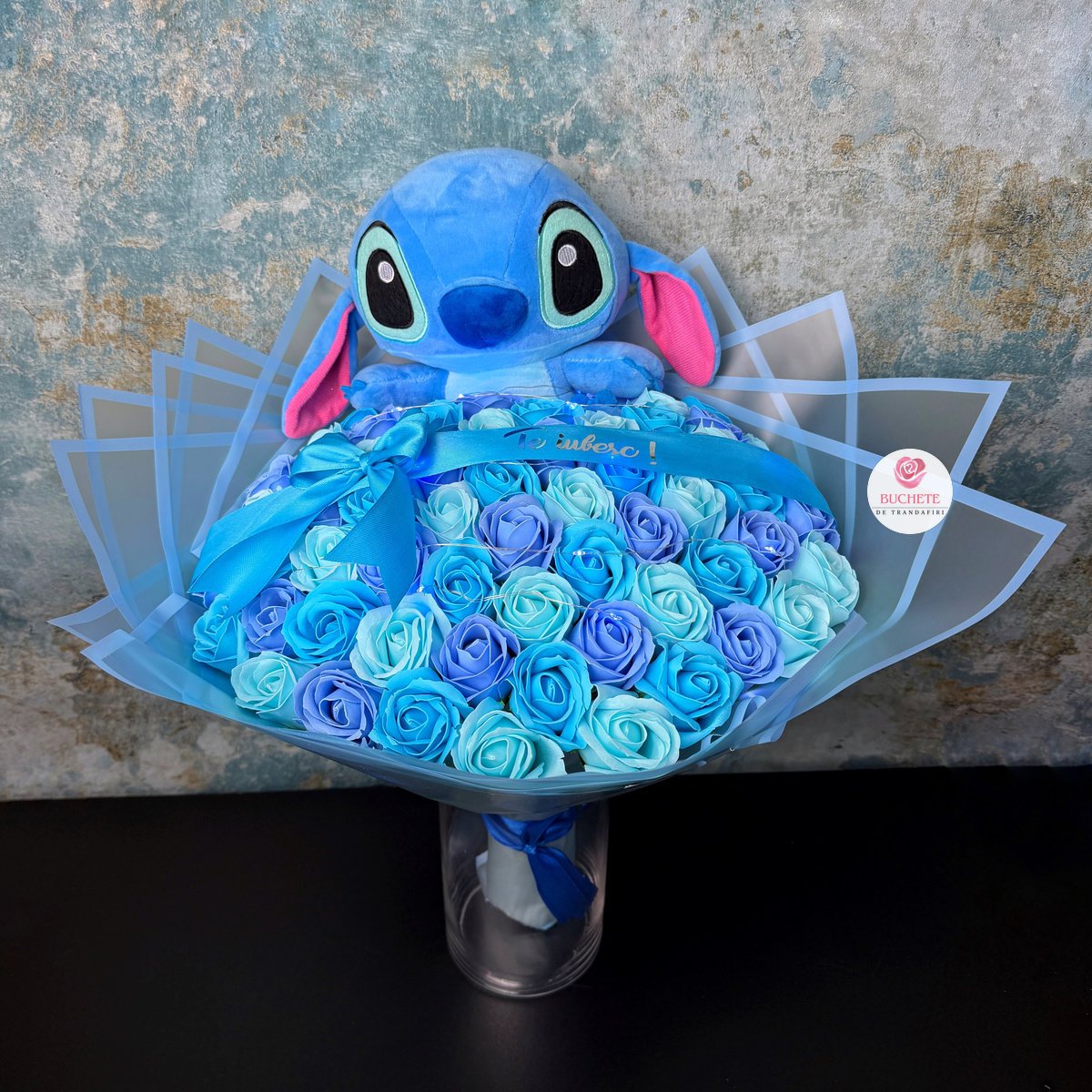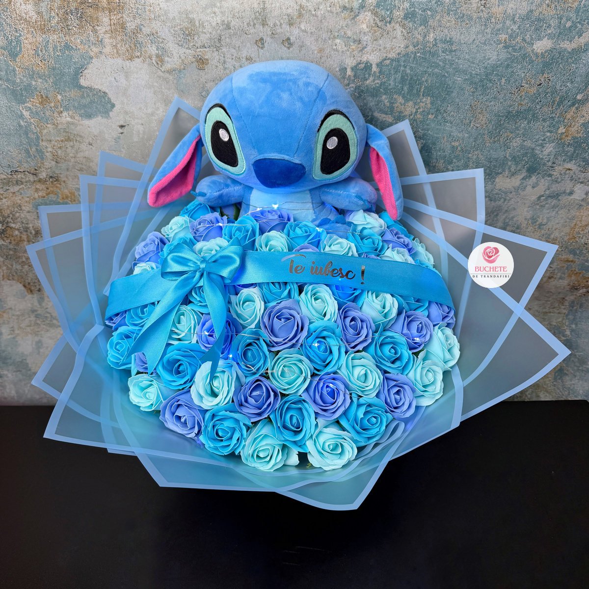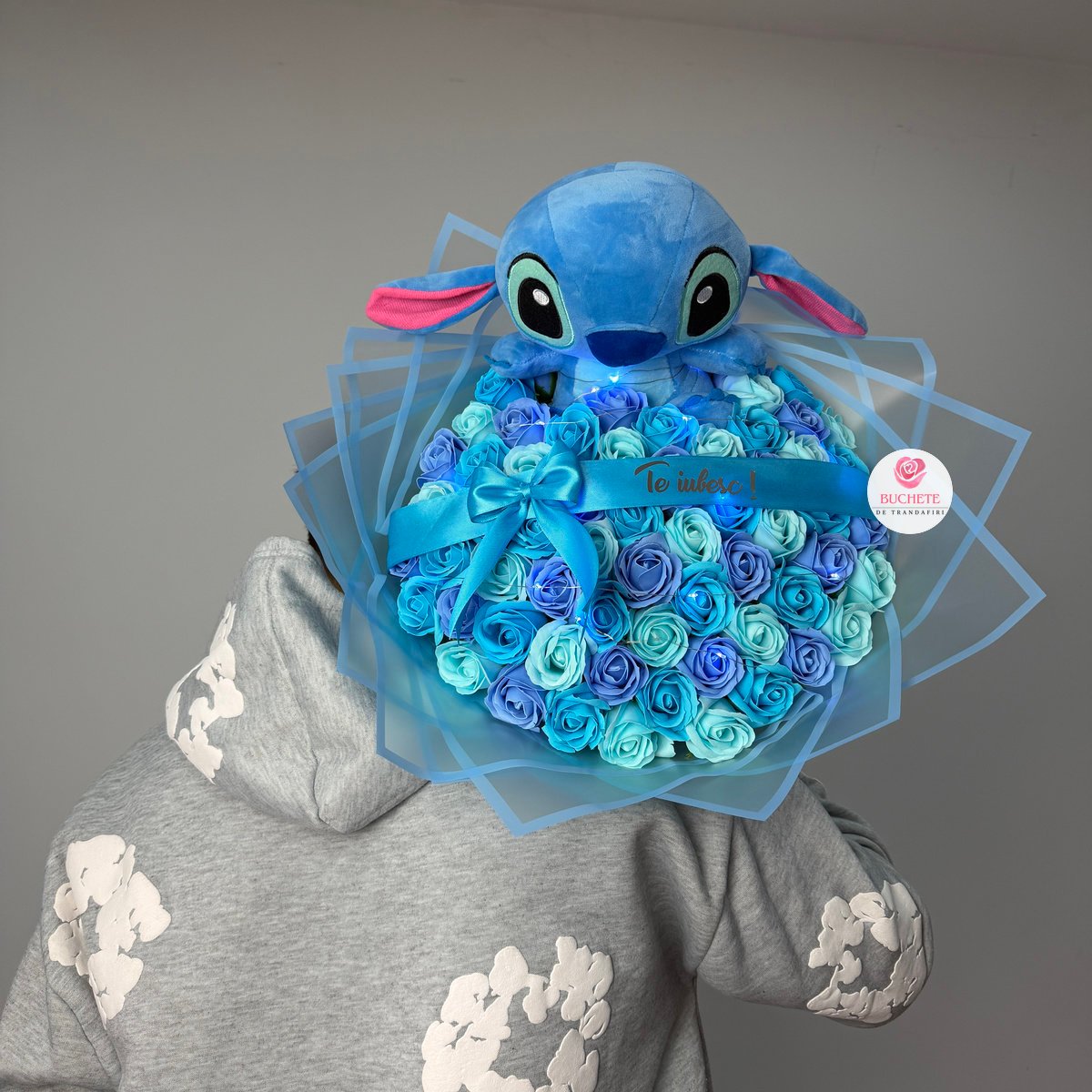 Buchet flori Stitch Albastru, 61 trandafiri din sapun, mesaj si luminite cadou