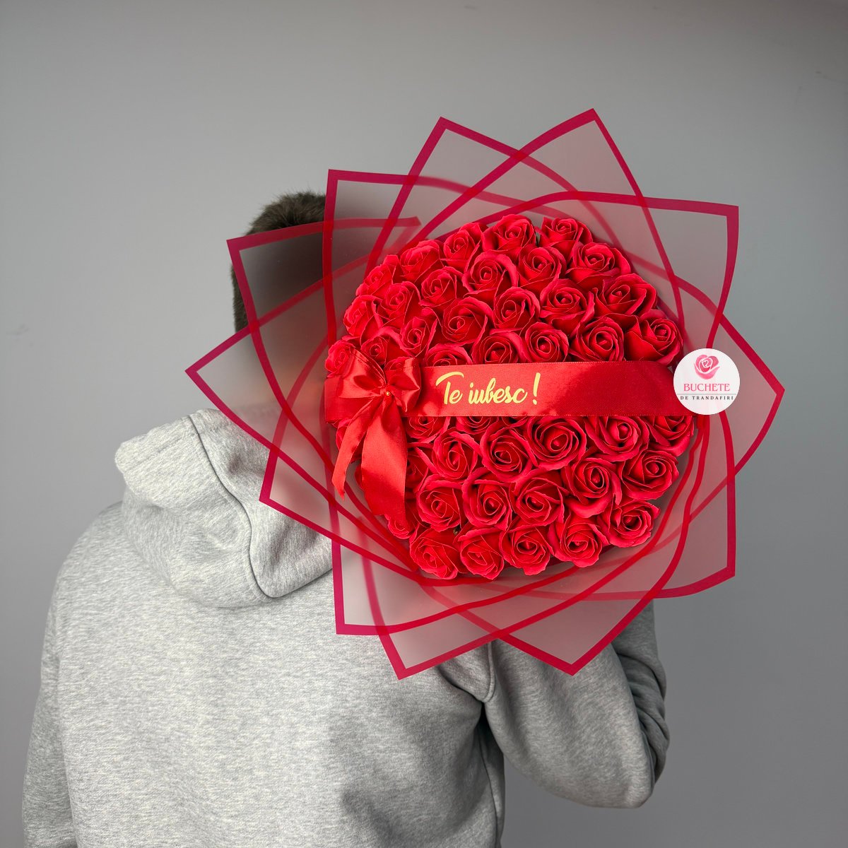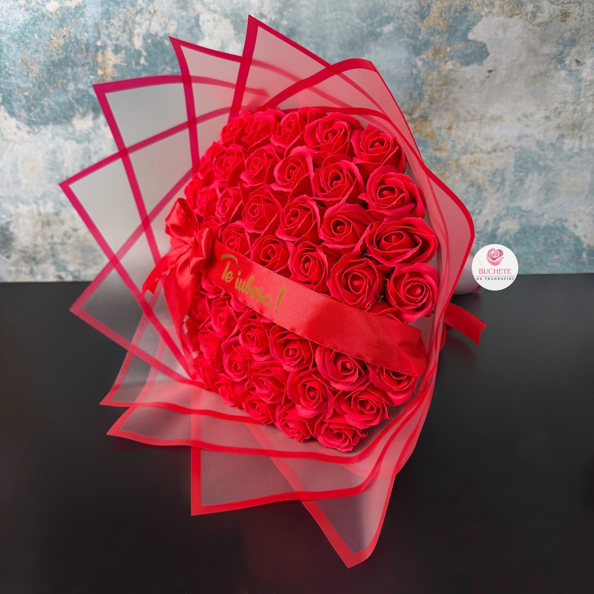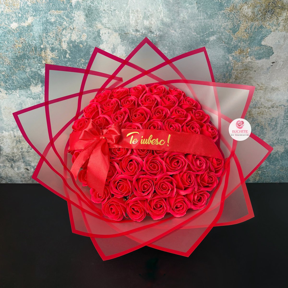 Buchetul este compus din 51 trandafiri de sapun in nuanta rosu intens, aranjati compact pentru volum echilibrat si aspect uniform. Petalele au un contur fin, iar forma ramane stabila in timp daca este pastrat corect. Include panglica cu mesaj Te iubesc!, un detaliu de personalizare care transforma gestul intr-o declaratie clara, exact ca un mesaj pentru iubita „Te iubesc! pe care il vezi zilnic. Produsul este fragil, de aceea ajunge protejat pentru transport: impachetat atent si asezat in cutie de curierat, astfel incat sa se pastreze forma si prezentarea.