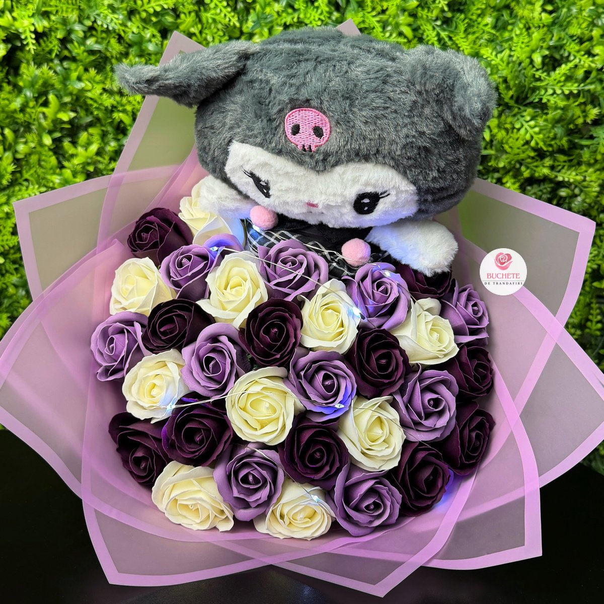 Buchet de flori cu jucarie Kuromi, 31 trandafiri din sapun si luminite cadou
