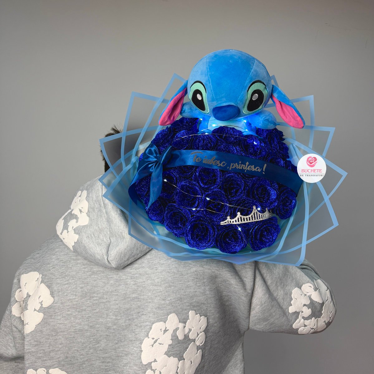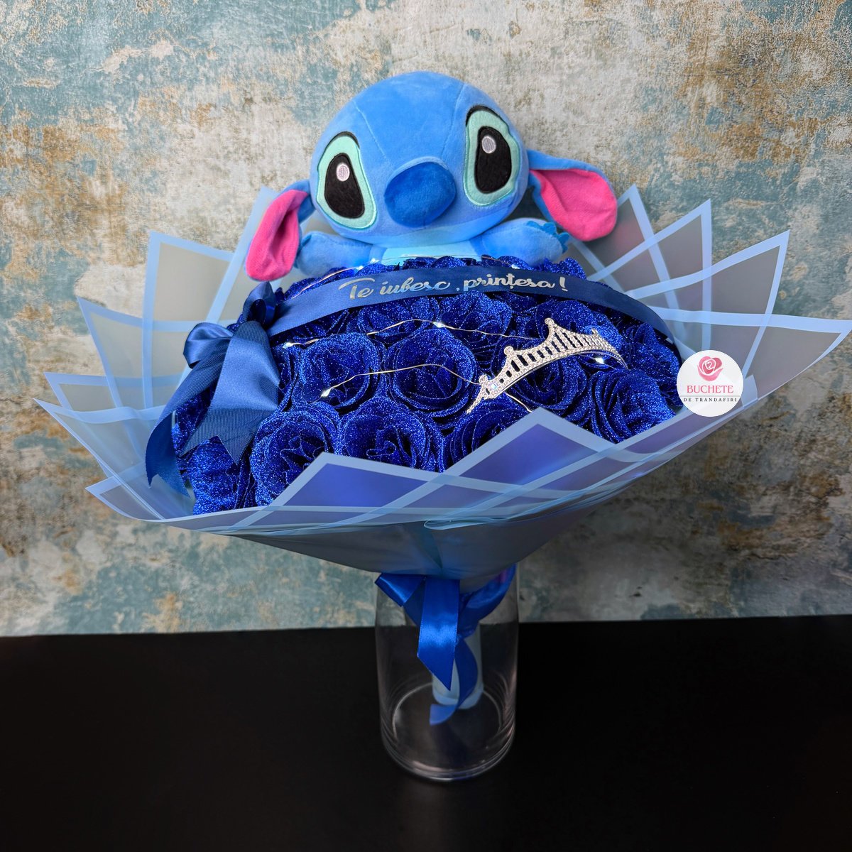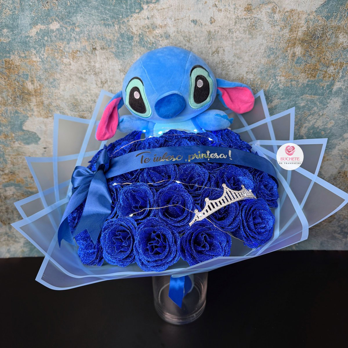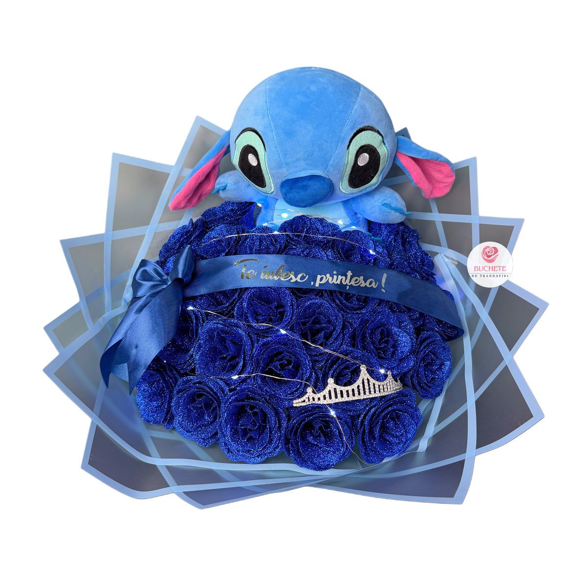 Trandafirii de sapun sunt fin finisati, cu petale bine conturate si sclipici albastru aplicat pentru un aspect elegant, fara sa incarce vizual. Aranjamentul include 29 trandafiri din sapun, elementul Stitch integrat in compozitie, luminite pentru accent de ambient si coronita pentru un look de cadou complet, plus panglica cu mesaj Te iubesc, printesa!. Buchet de Trandafiri cu Stitch este un cadou care se pastreaza usor si arata bine in timp, daca este protejat corect. Produsul este fragil, de aceea ajunge impachetat atent si fixat pentru transport, in cutie de curierat, astfel incat sa il primesti in siguranta.