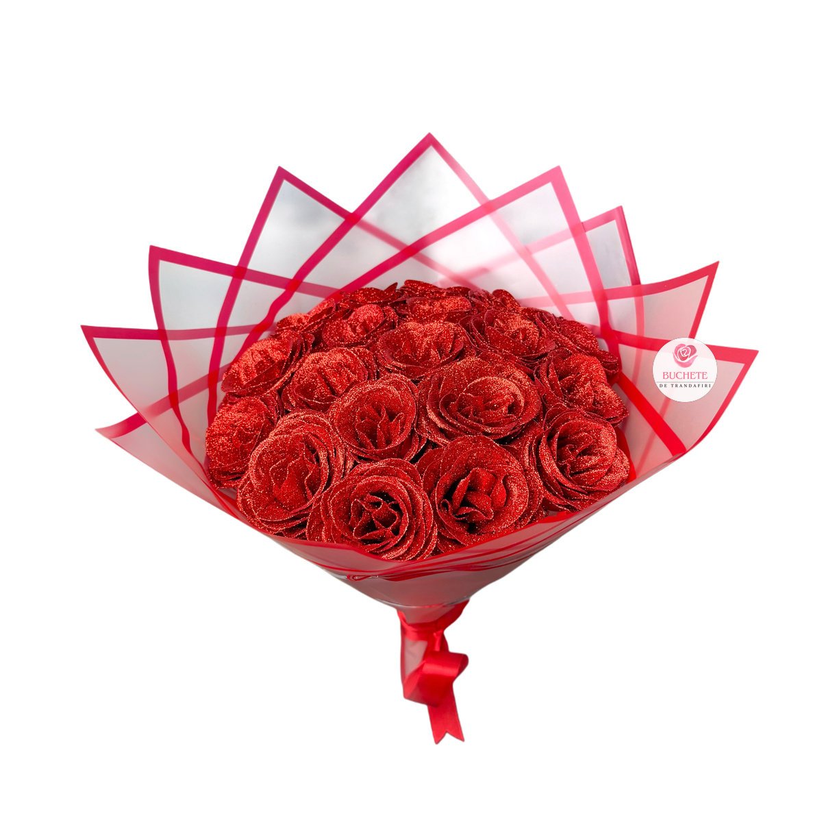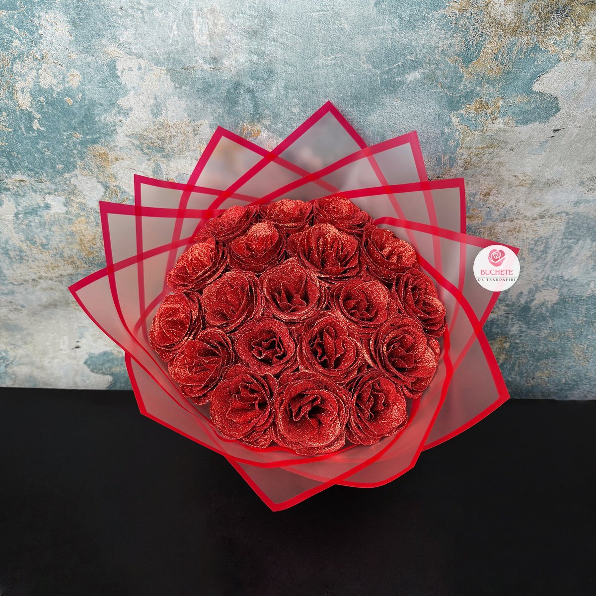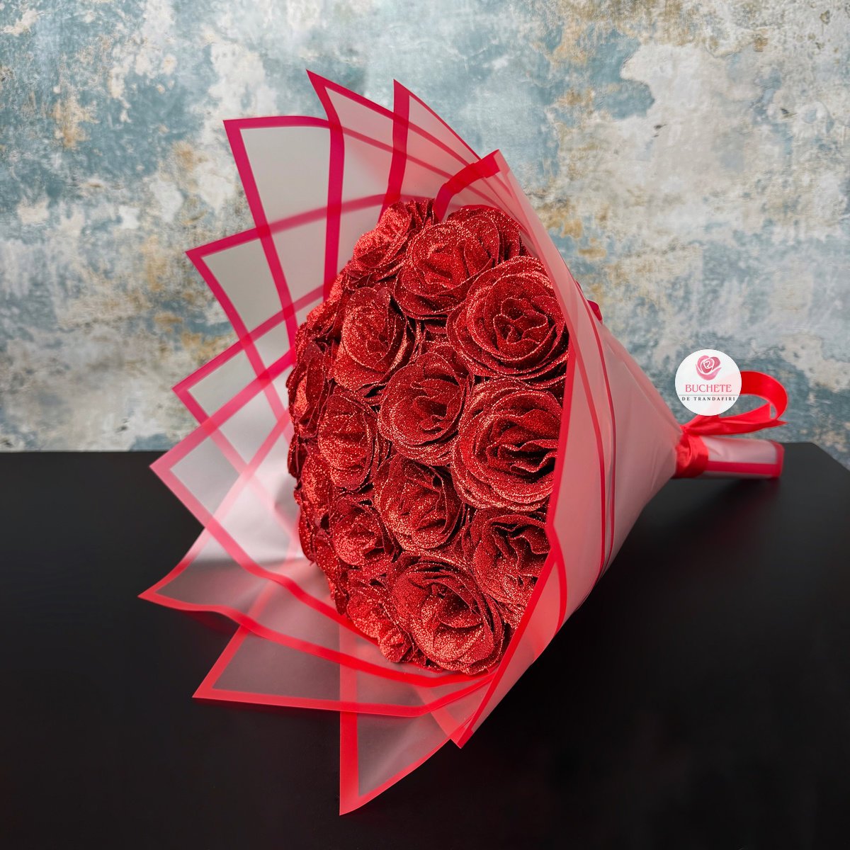 Cand vrei sa daruiesti ceva care sa ramana, nu doar sa fie admirat o zi, acest buchet este alegerea potrivita. Florile naturale se ofilesc repede, iar momentul se pierde odata cu ele; aici primesti o surpriza care isi pastreaza forma si farmecul, zi dupa zi. Rosul intens si sclipiciul discret creeaza o prezenta eleganta, potrivita pentru o persoana draga, pentru un birou sau pentru un colt de acasa in care vrei sa ramana o amintire vizibila.