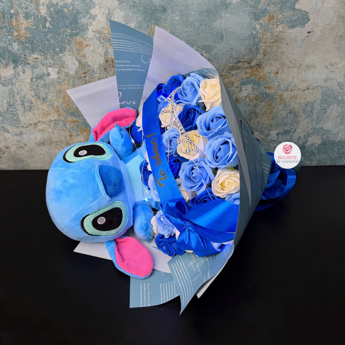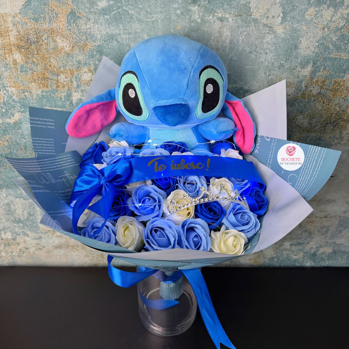 Buchet Stitch Albastru, mesaj „Te iubesc!” coronita si luminite cadou, 31 trandafiri