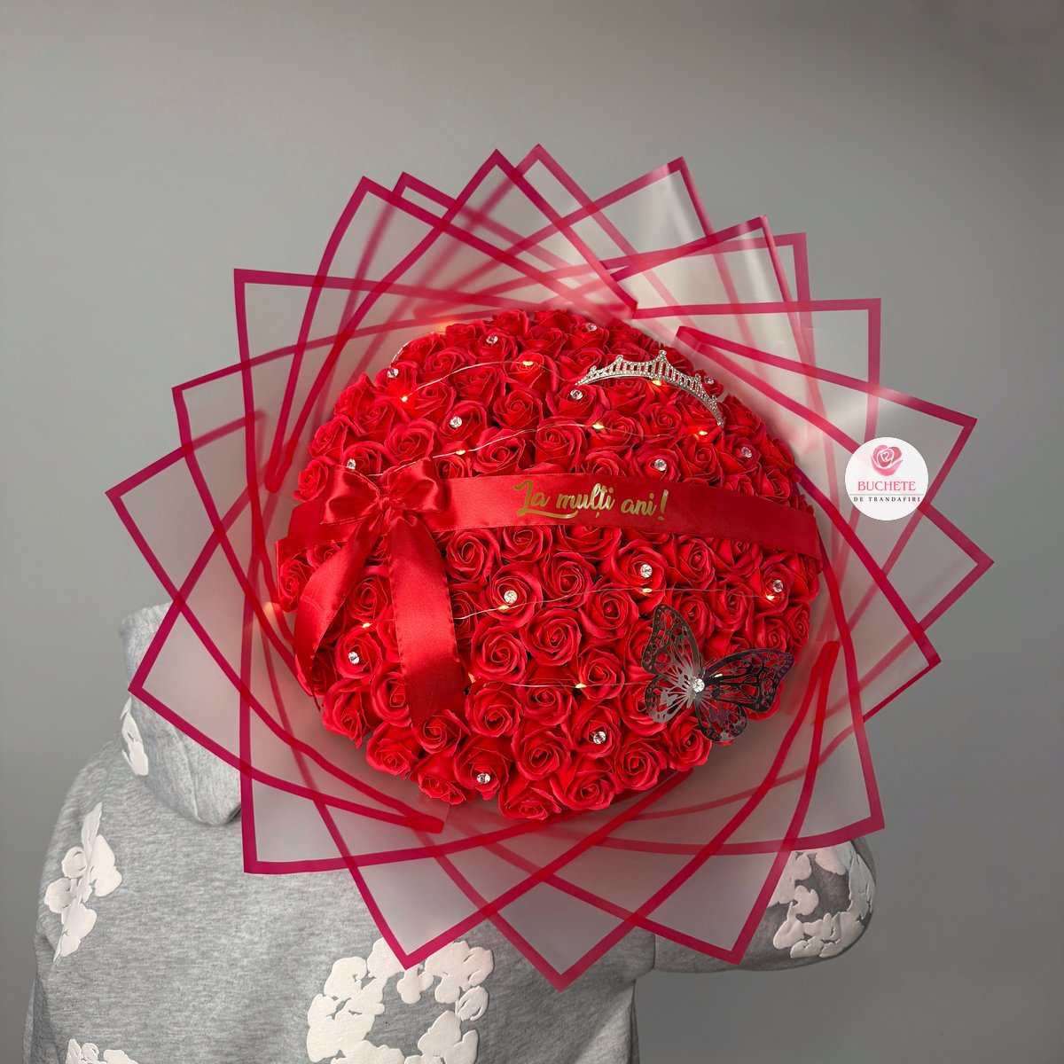 Trandafirii de sapun sunt realizati cu atentie la finisaj, cu petale bine conturate si un aspect uniform, astfel incat aranjamentul sa isi pastreze eleganta in timp. Buchetul include 101 trandafiri rosii, coronita, luminite, accente tip diamant si un fluturas decorativ, pentru un plus de personalitate. Panglica este personalizata cu mesajul La multi ani!, integrat discret pentru a completa povestea cadoului. Produsul este fragil, de aceea il pregatim pentru transport in ambalaj protector, astfel incat sa ajunga in siguranta si sa arate impecabil la despachetare.