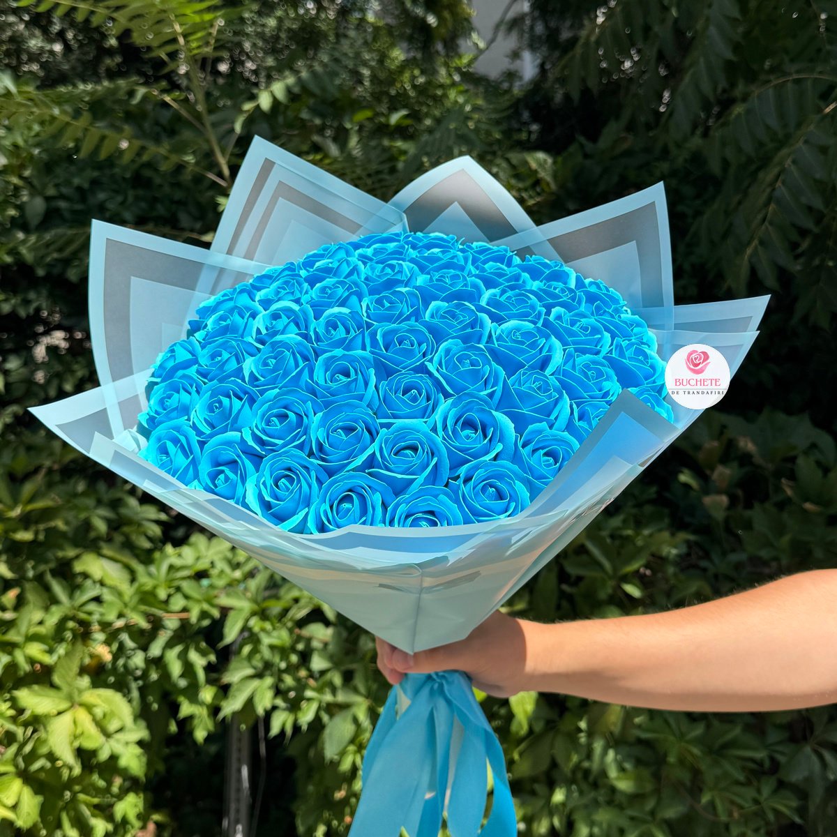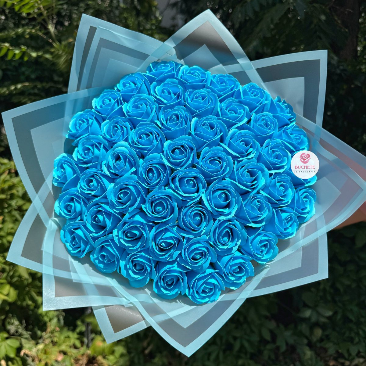 Buchet trandafiri albastri de sapun este un aranjament premium realizat din 51 de trandafiri de sapun parfumati, creat pentru cei care cauta un cadou rafinat si usor de pastrat. Se potriveste perfect pentru a fi oferit persoanei iubite, unei prietene, mamei sau unei colege, dar si ca decor in casa ori la birou. Daca florile naturale sunt minunate, ele trec repede; acest buchet este o alternativa practica atunci cand vrei un gest care ramane frumos o perioada indelungata.