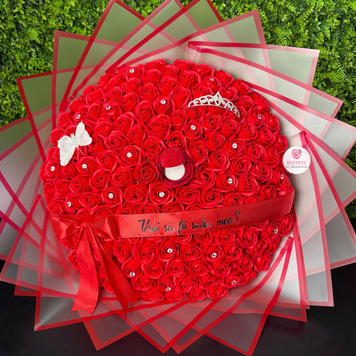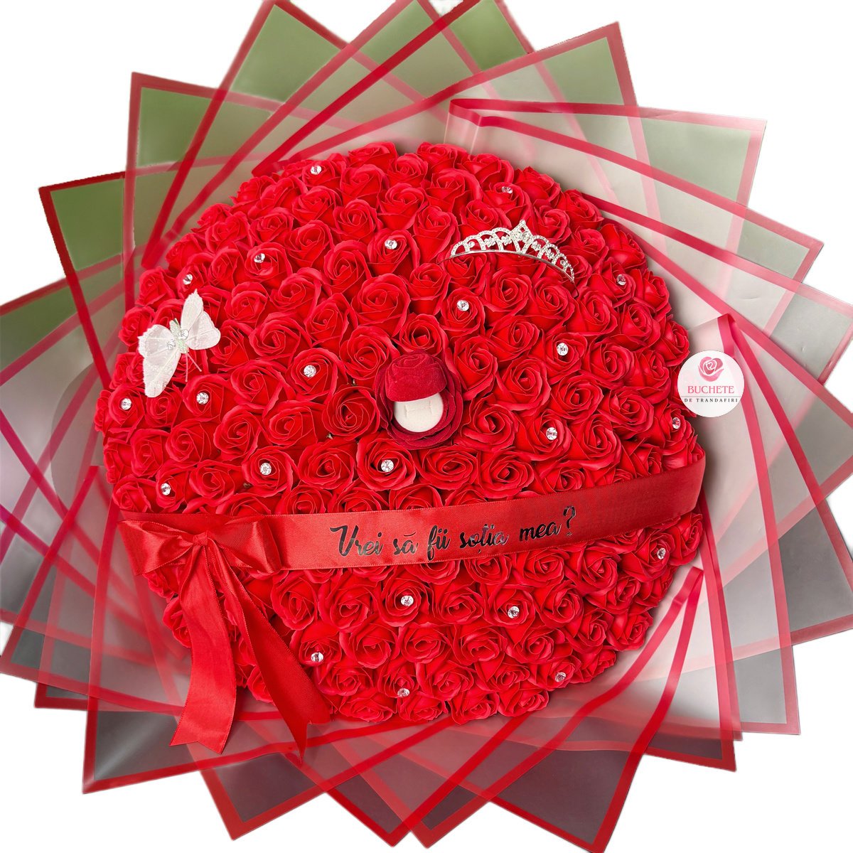 Trandafirii din sapun au un aspect atent finisat, cu petale definite si o culoare rosie intensa, potrivita pentru o declaratie curajoasa. Compozitia este densa si echilibrata, astfel incat buchetul arata bine in fotografii si ramane stabil la expunere. In interior este integrat inelul, iar la exterior sunt adaugate luminite pentru o stralucire discreta, o coronita decorativa si un fluturas care completeaza tema romantica. Panglica este personalizata cu mesajul Vrei sa fii sotia mea? Produsul este fragil si ajunge ambalat pentru transport, in cutie de curierat, protejat pentru a-si pastra forma si detaliile.