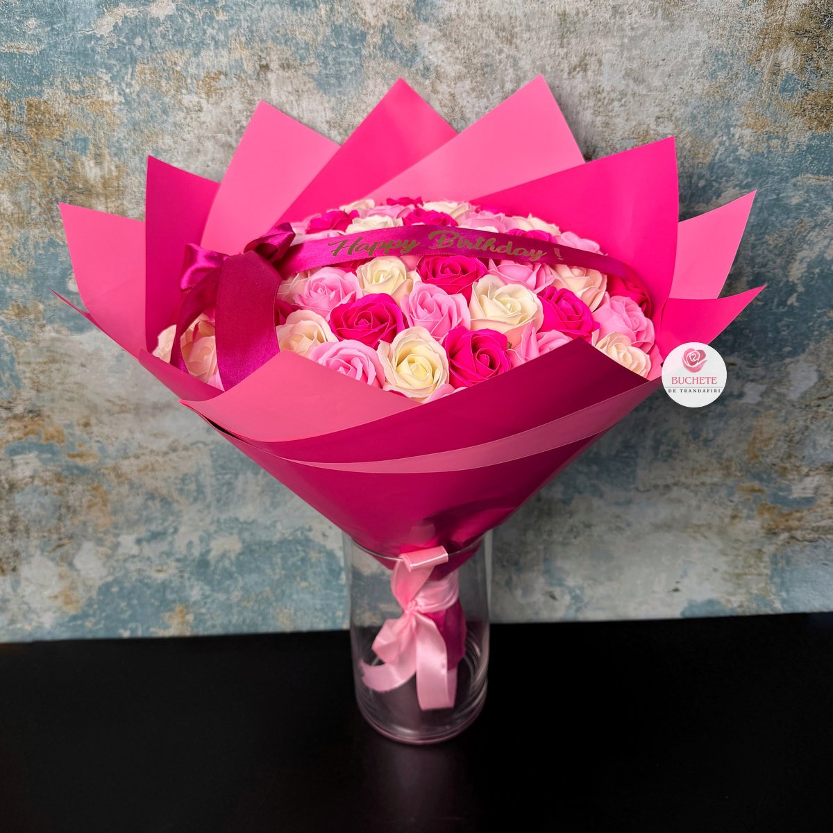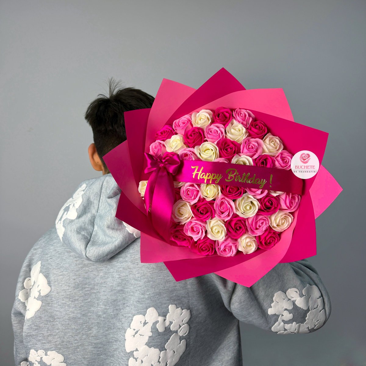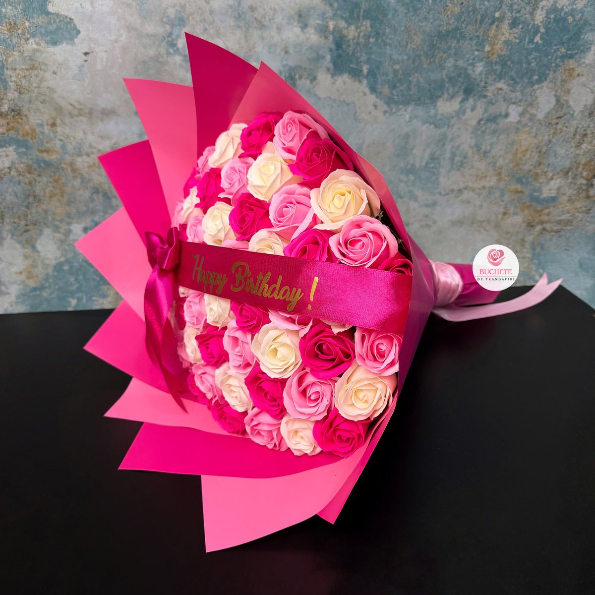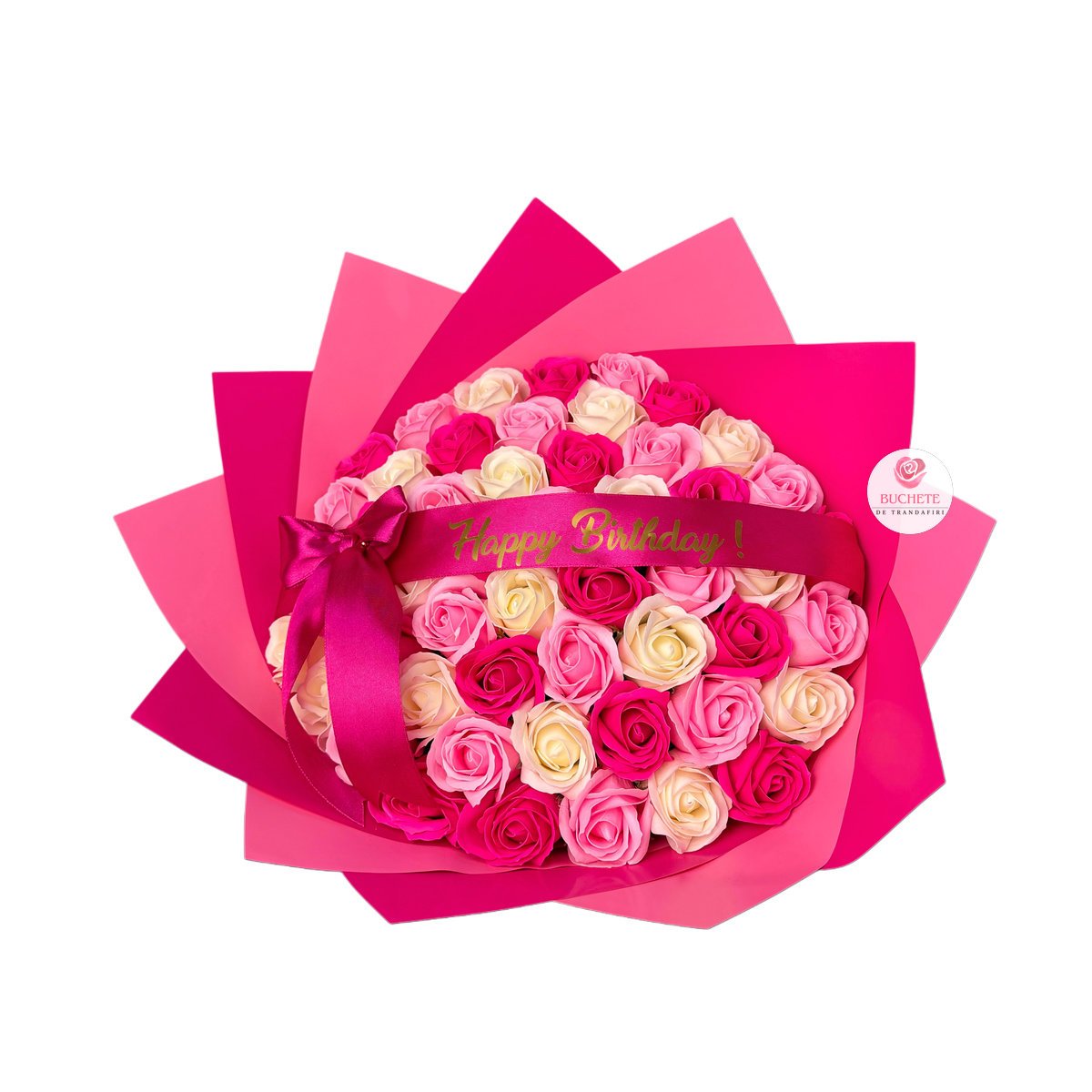 Buchet trandafiri de sapun roz pentru Zi de nastere cu mesaj „Happy Birthday!”, 51 fire