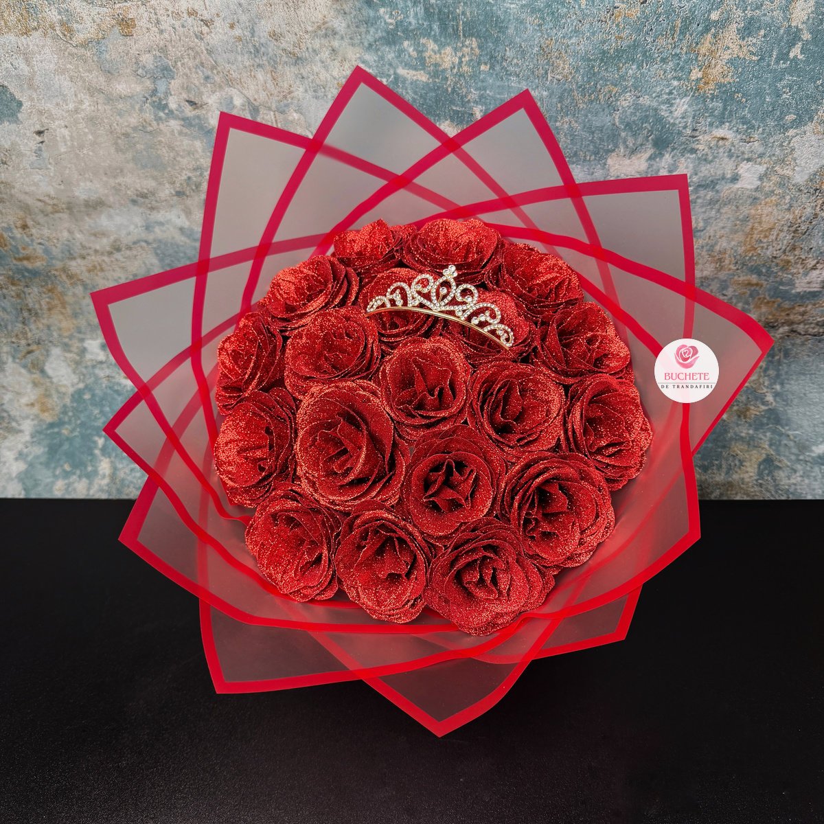 Cand vrei sa oferi un cadou care sa spuna „m-am gandit la tine” si sa ramana frumos mult timp, alegerea potrivita este un aranjament care nu se ofileste. Acest buchet rosu, cu sclipiri fine si o coronita delicata, pastreaza emotia momentului si dupa ziua in care este daruit. In locul grijii ca florile naturale se trec rapid, ai o surpriza eleganta, usor de pastrat, care devine decor si amintire in acelasi timp.