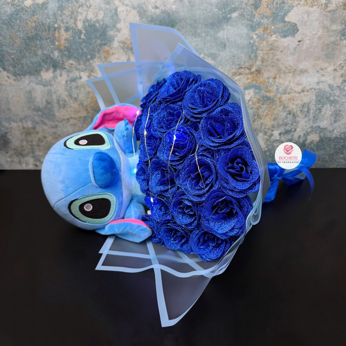 Buchet Trandafiri Stitch albastru cu sclipici, 19 fire cu luminite cadou