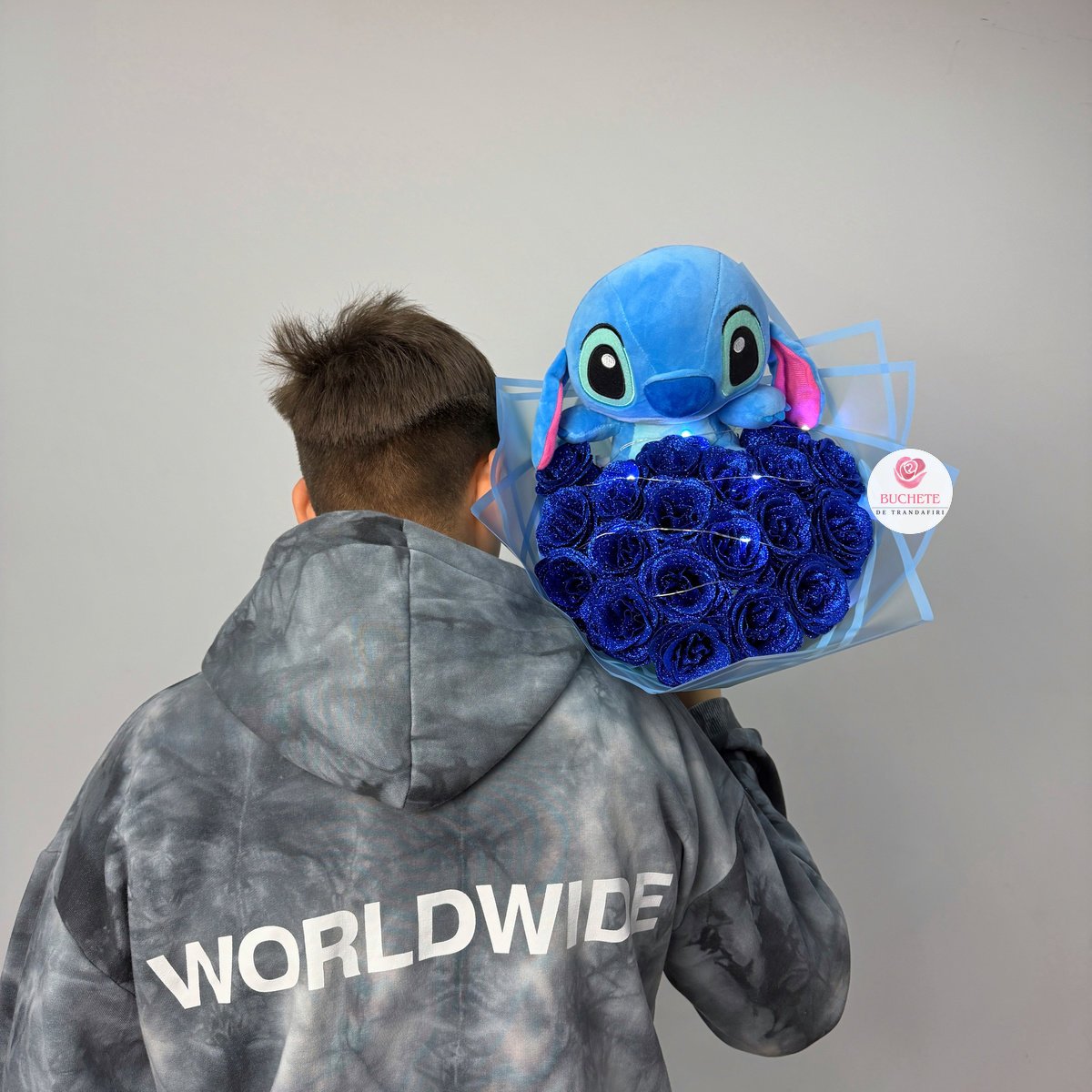 Buchet Trandafiri Stitch Albastru este un aranjament cadou cu 19 trandafiri de sapun in nuante albastre, cu sclipici fin si un personaj Stitch integrat, gandit pentru persoane care iubesc surprizele cu personalitate: partener/partenera, prieteni, colege sau adolescenti. Este o alternativa practica atunci cand vrei un gest memorabil, fara grija ofilirii rapide. Spre deosebire de florile naturale, acest buchet nu cere vaza si nu se transforma intr-o amintire scurta, ci intr-un decor usor de pastrat.