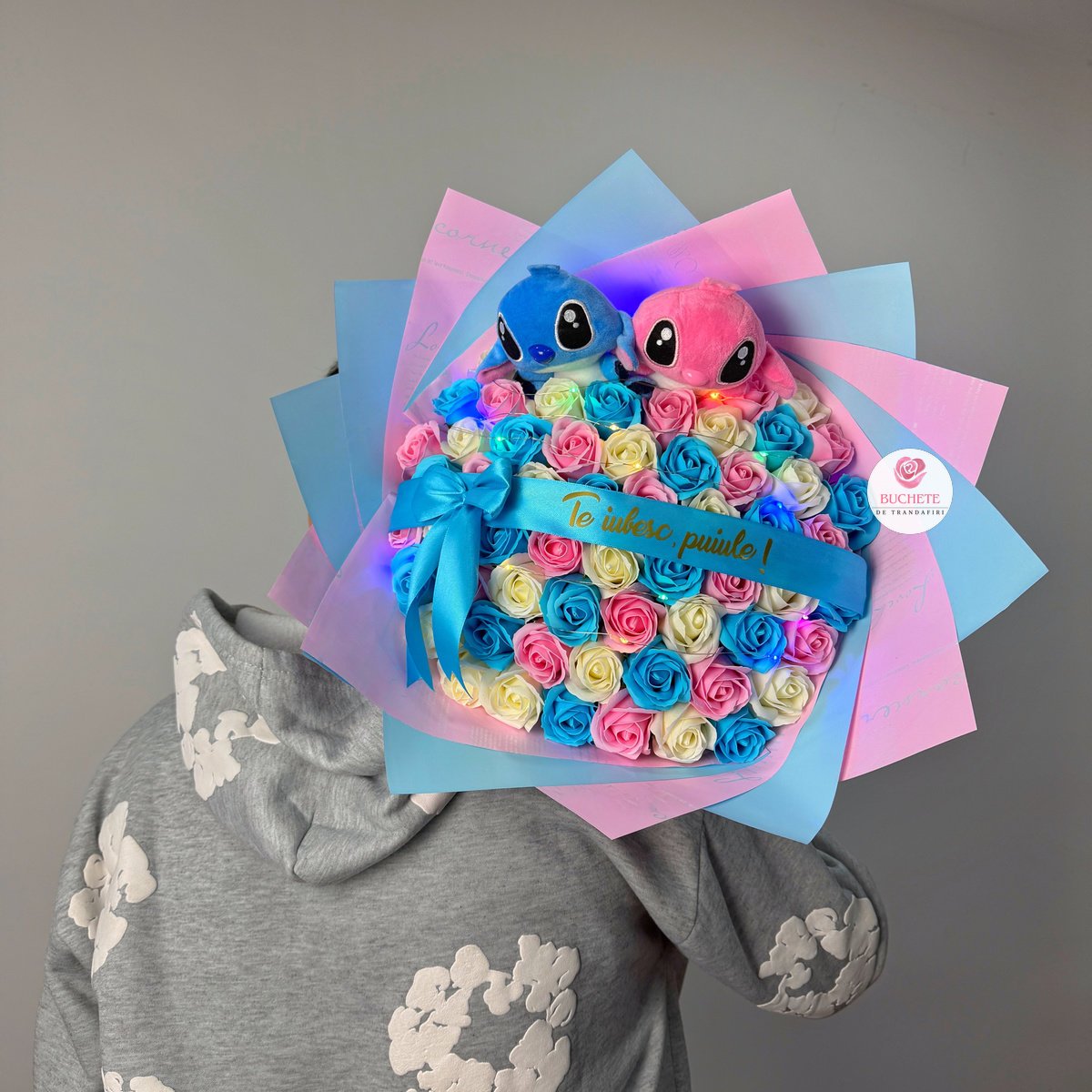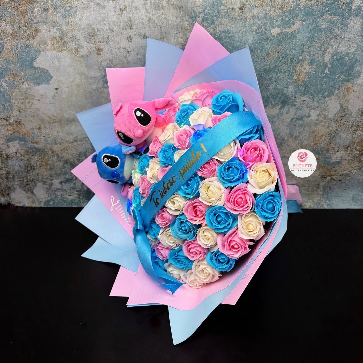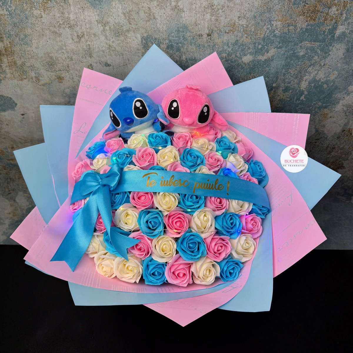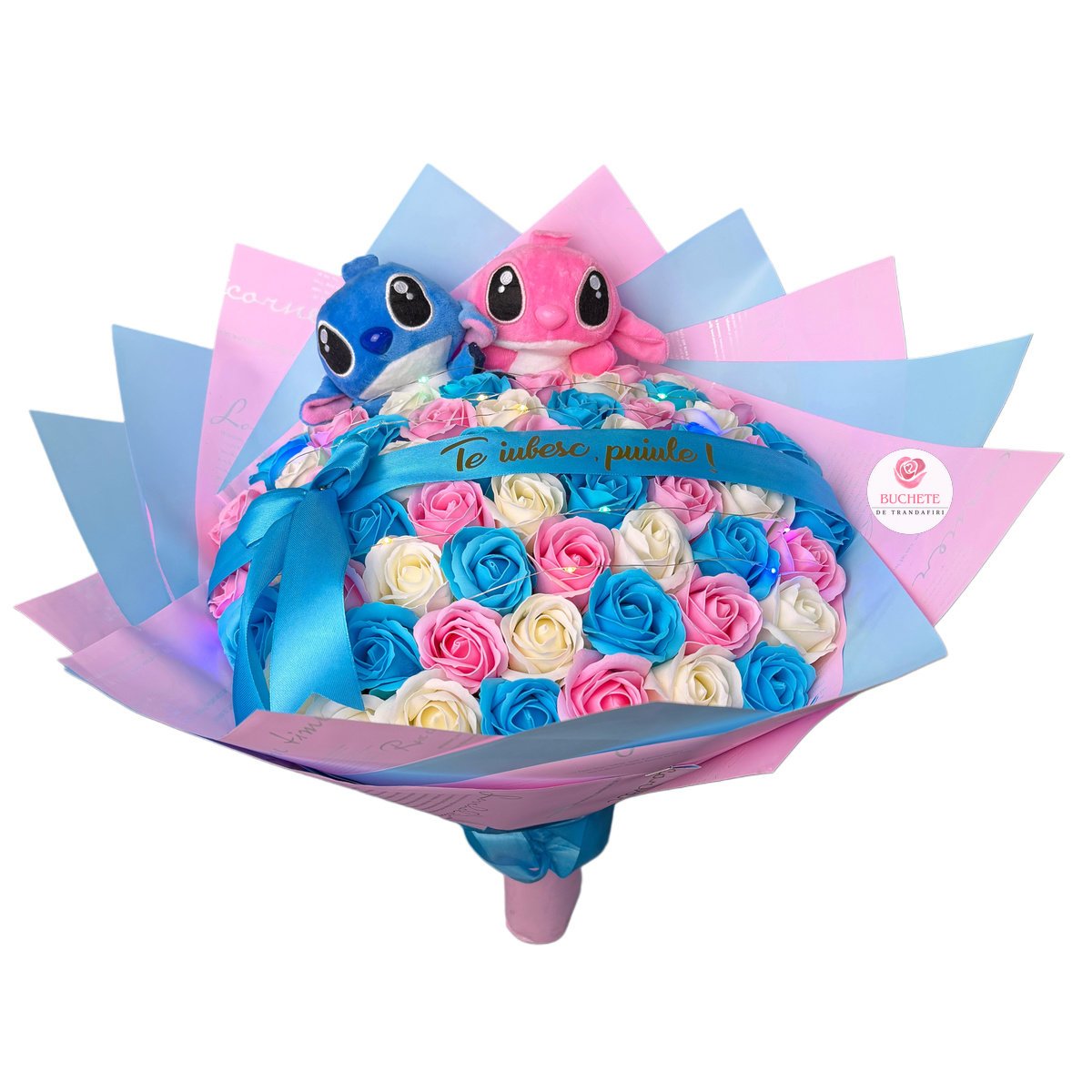 Buchet Stitch Albastru si Roz, 61 trandafiri de sapun si mesaj Personalizat, luminite cadou Prețul inițial a fost: lei419.90.Prețul curent este: lei379.90.