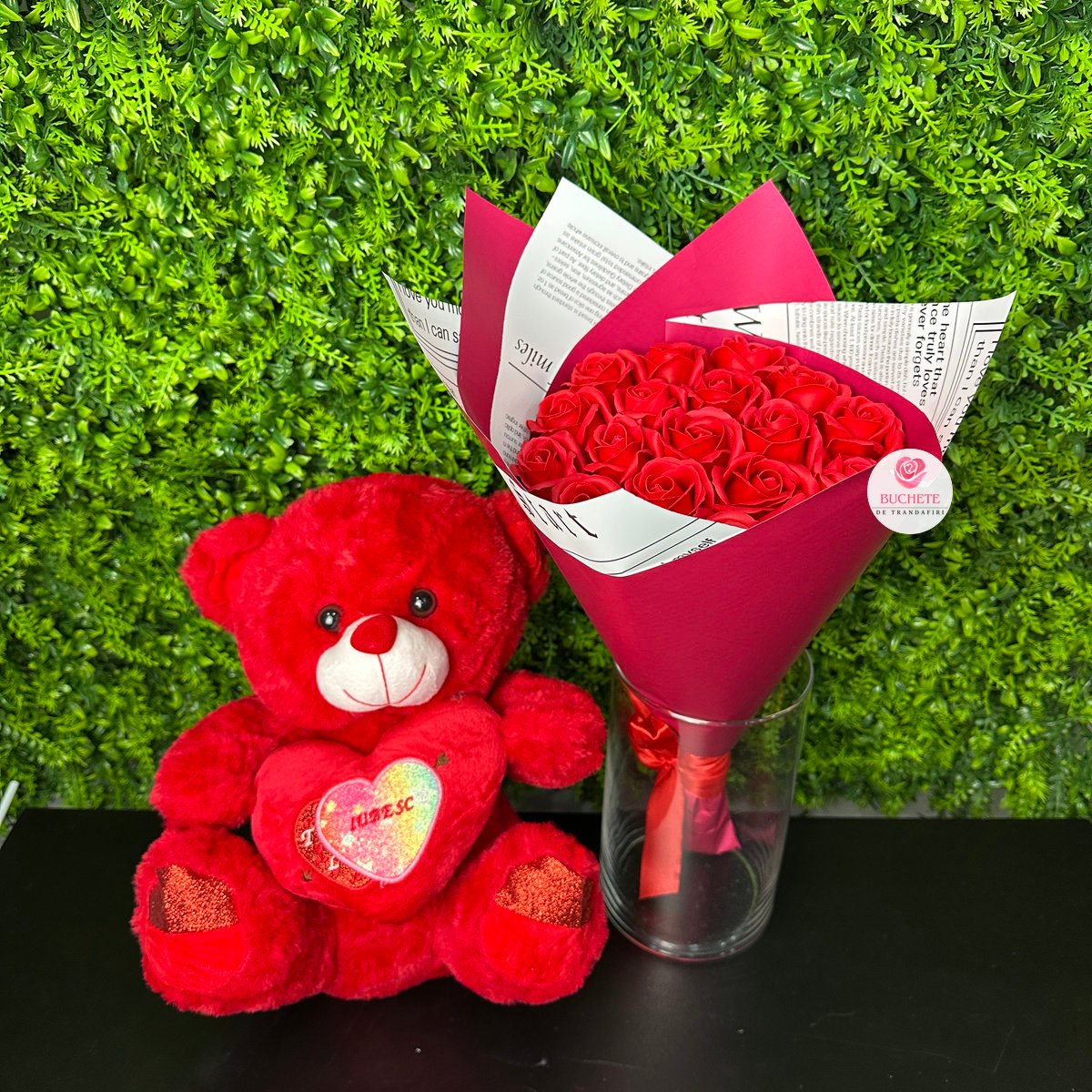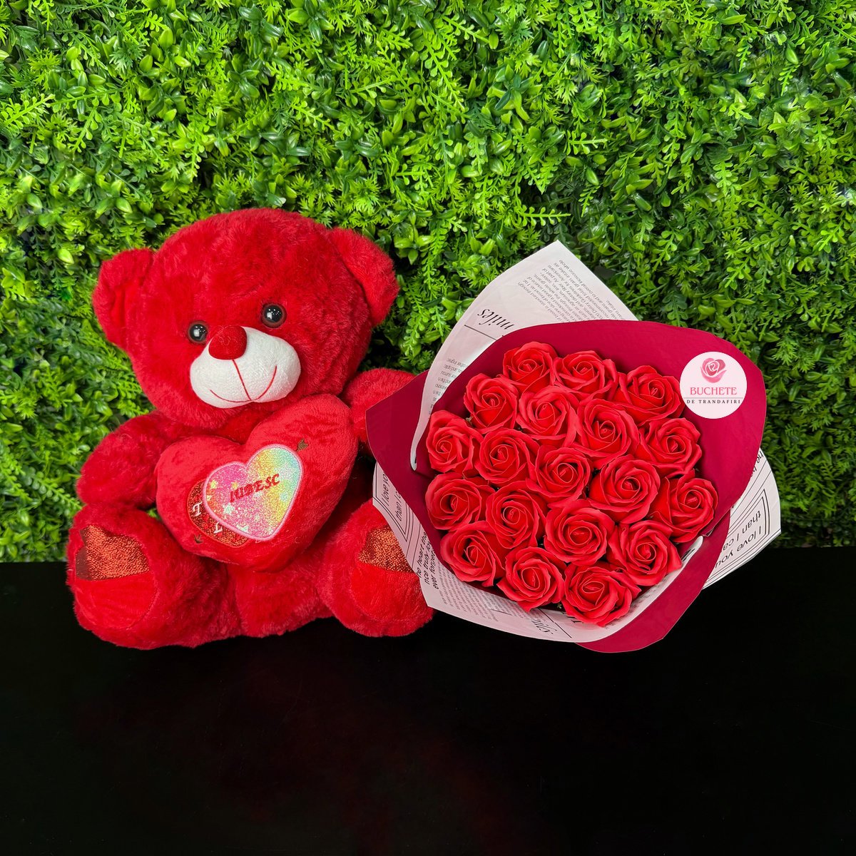 Cadou iubita Valentine’s day – Buchet 19 trandafiri din sapun Rosu si Ursulet de plus