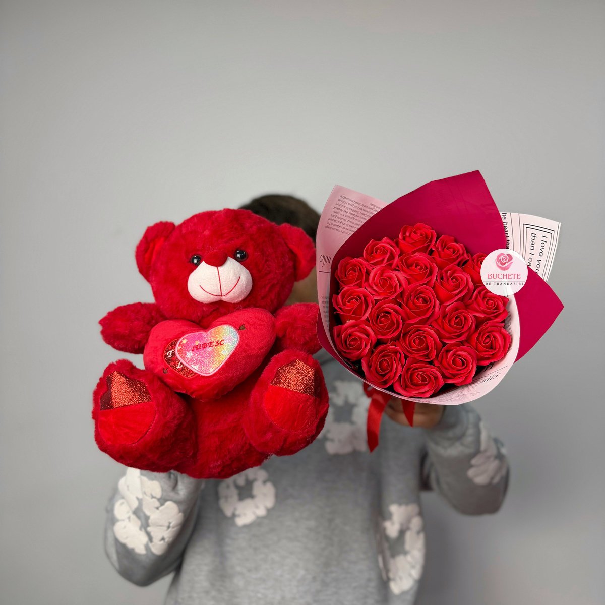De ce acest cadou? Pentru ca unele emotii merita pastrate, nu doar oferite pentru o zi. Florile naturale sunt frumoase, dar se ofilesc repede; acest aranjament cu trandafiri din sapun ramane elegant si usor de pastrat, ca o amintire discreta in casa sau la birou. Imagineaza-ti momentul in care deschide cutia si gaseste un buchet rosu intens, completat de un mic companion pufos, gata sa spuna „m-am gandit la tine” fara multe cuvinte.