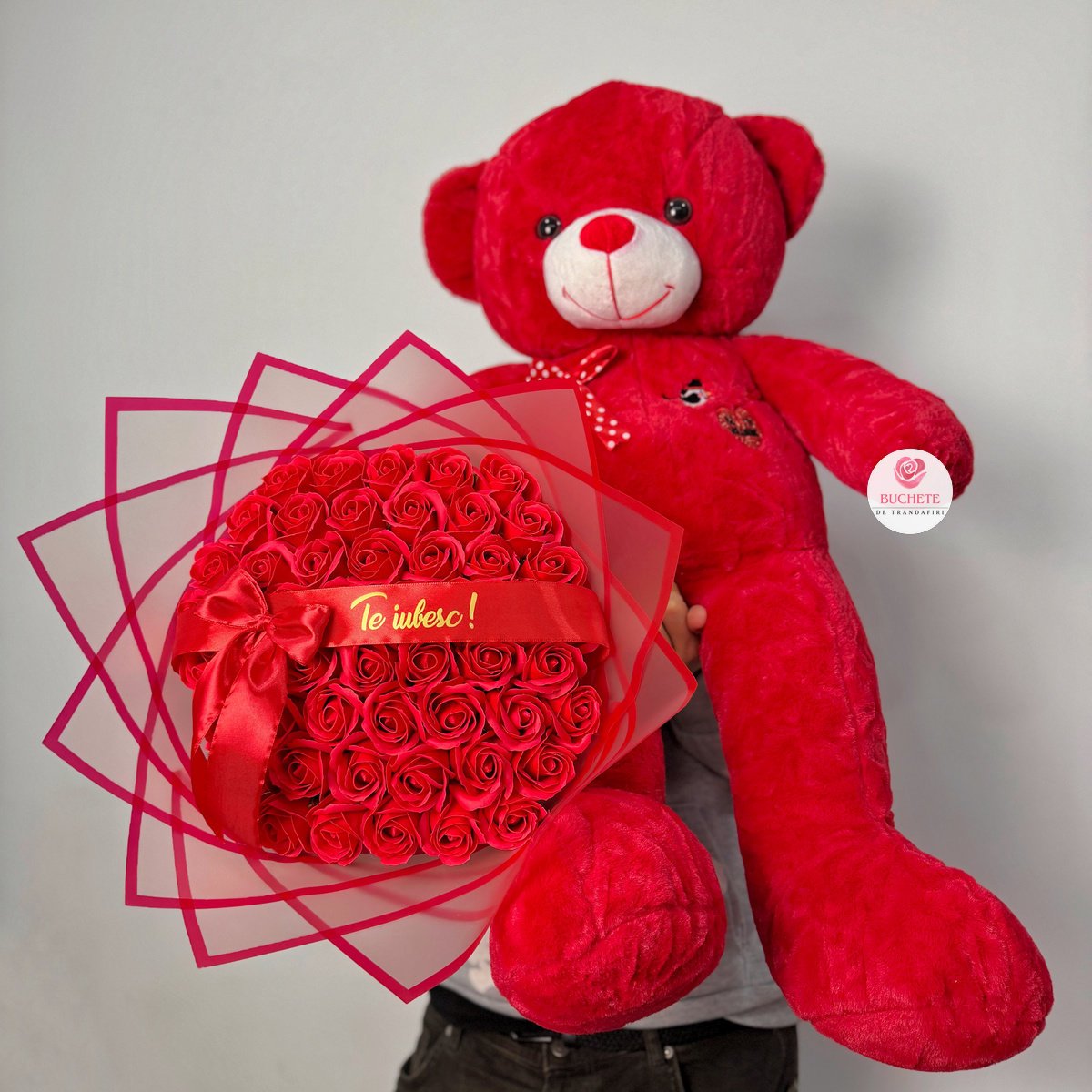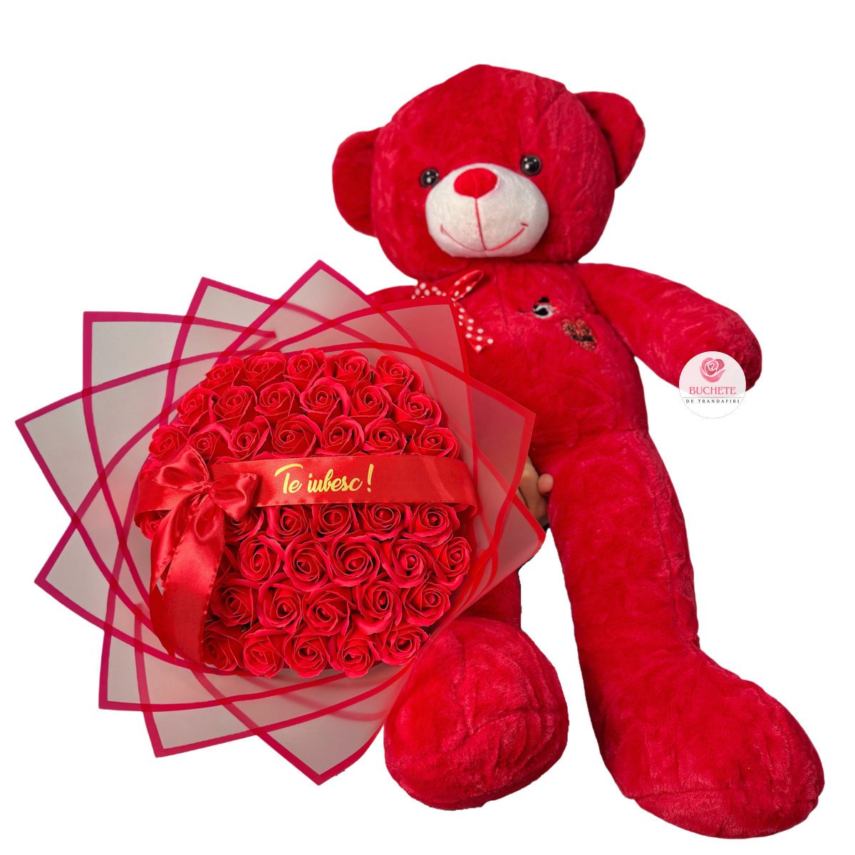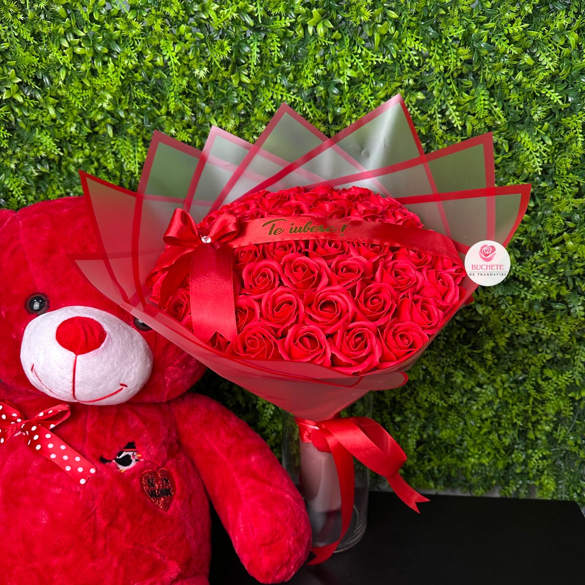 Trandafirii din sapun sunt realizati pentru un aspect elegant, cu petale bine conturate si o nuanta intensa de rosu, astfel incat aranjamentul isi pastreaza tinuta in timp. Buchetul contine 51 trandafiri din sapun si este completat de o urs de plus de dimensiune generoasa, pentru un echilibru intre rafinament si emotie. Detaliul de personalizare este panglica cu mesaj Te iubesc!, integrata vizual in aranjament. Fiind un produs fragil, ajunge impachetat pentru transport, protejat in cutie de curierat, astfel incat sa fie livrat in siguranta si sa arate ca in poze la deschidere.