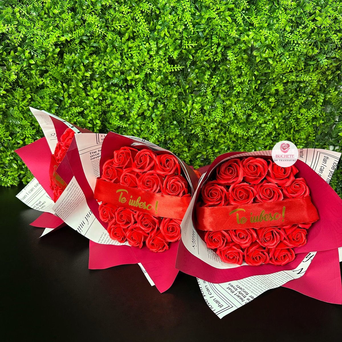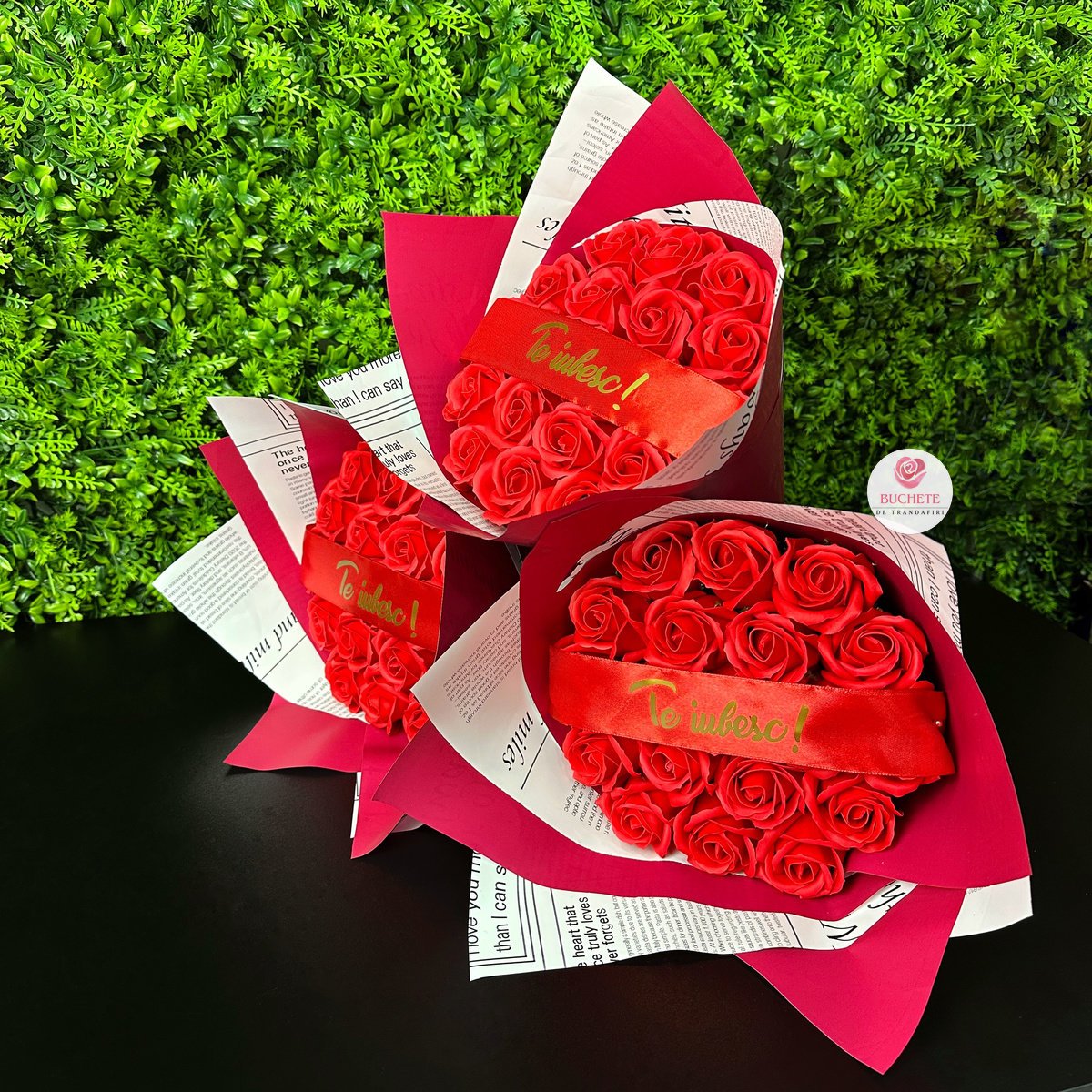 3x Buchete de flori de Valentine’s day de 19 trandafiri din sapun Rosii cu mesaj Te iubesc!