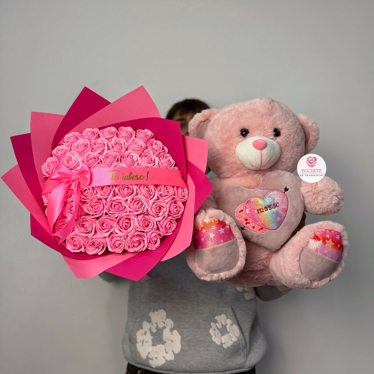 Trandafirii din sapun sunt realizati pentru un aspect uniform si rafinat, cu petale bine conturate si o nuanta roz care complimenteaza decorurile moderne sau romantice. Aranjamentul contine 51 de trandafiri din sapun, integrati intr-un buchet echilibrat, alaturi de un urs de plus care completeaza gestul cu o nota calda si tactila. Panglica cu mesaj Te iubesc! adauga acel detaliu direct, care face cadoul sa para ales special, nu doar cumparat. Produsul este considerat fragil si ajunge protejat, impachetat pentru transport, astfel incat sa isi pastreze forma si aspectul pana la destinatie.