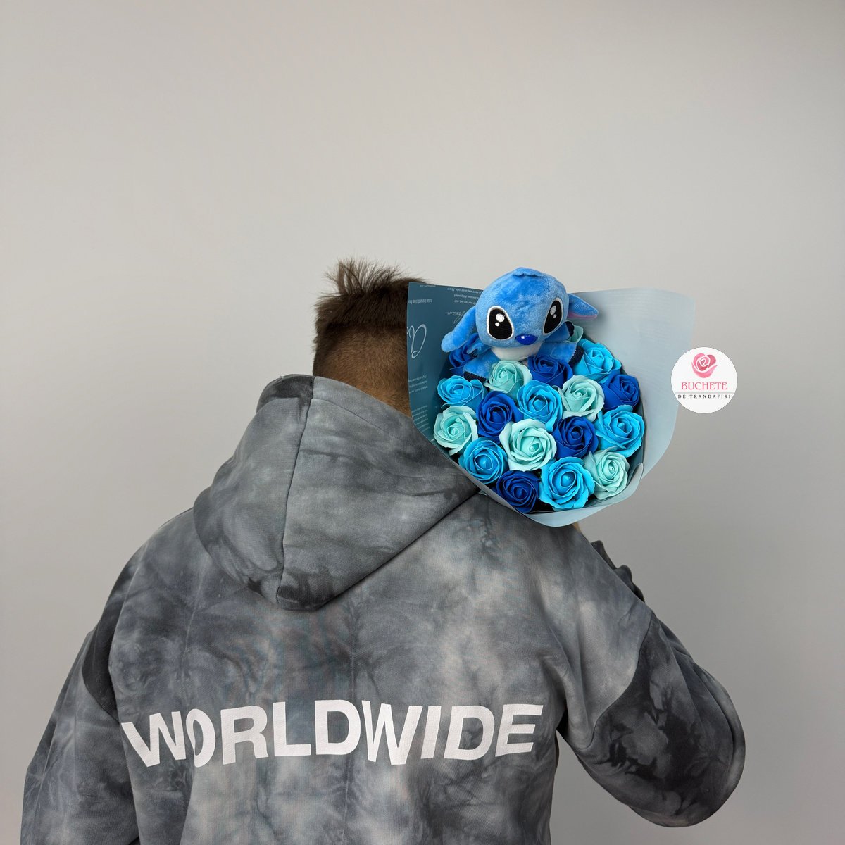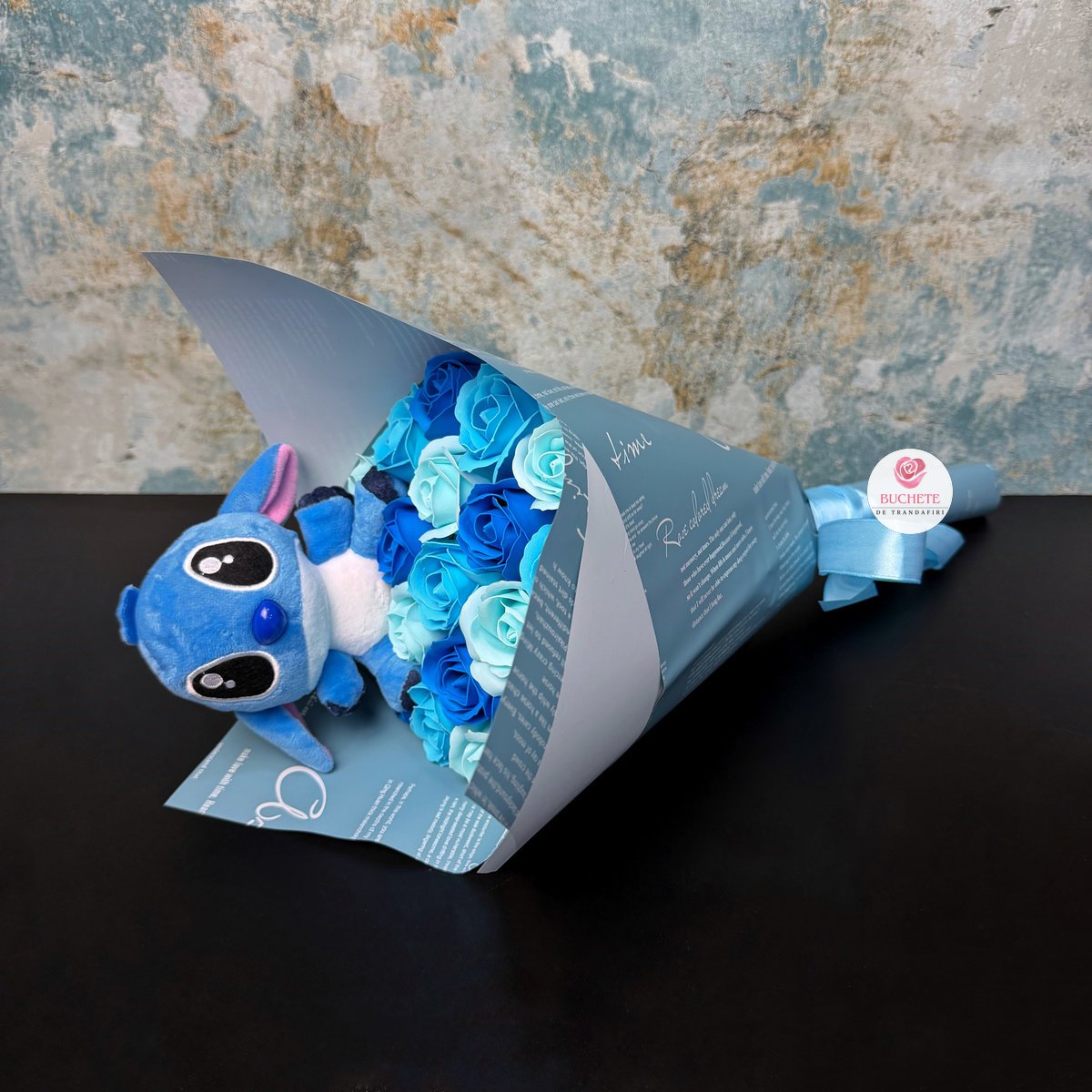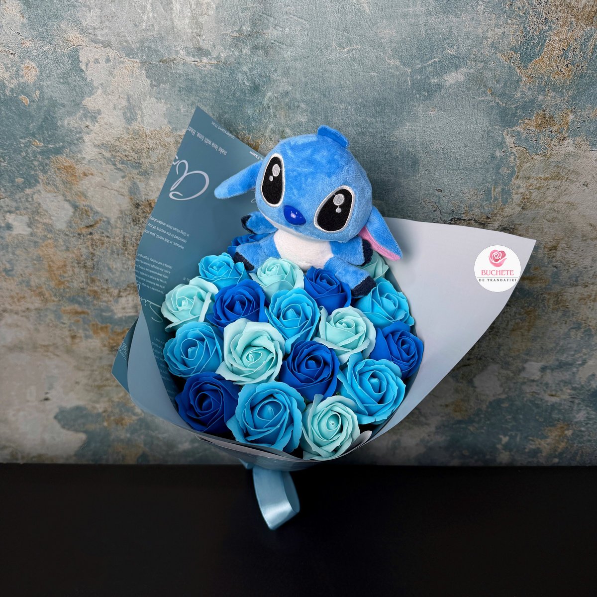 Stitch Buchet de flori Albastru, 19 trandafiri din sapun