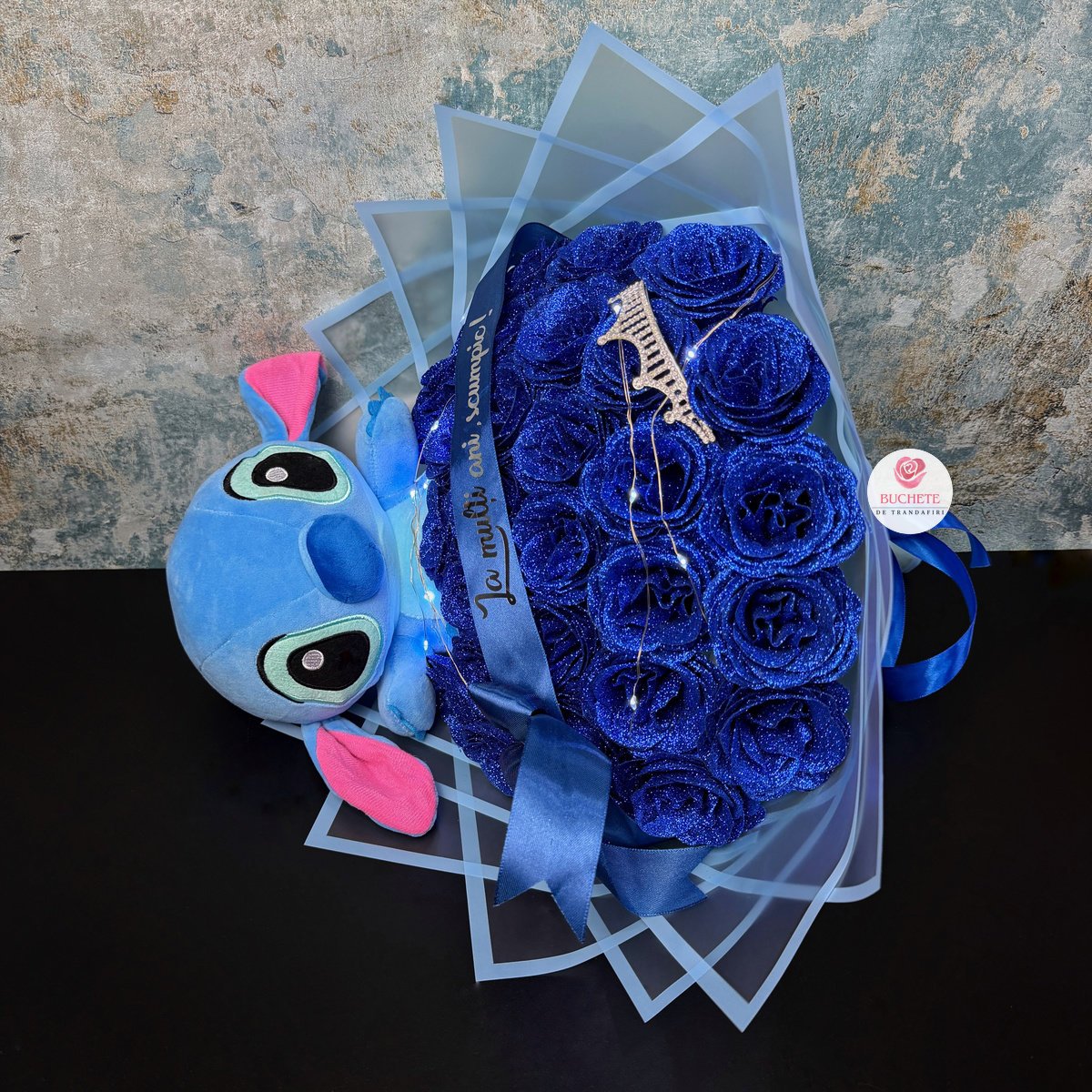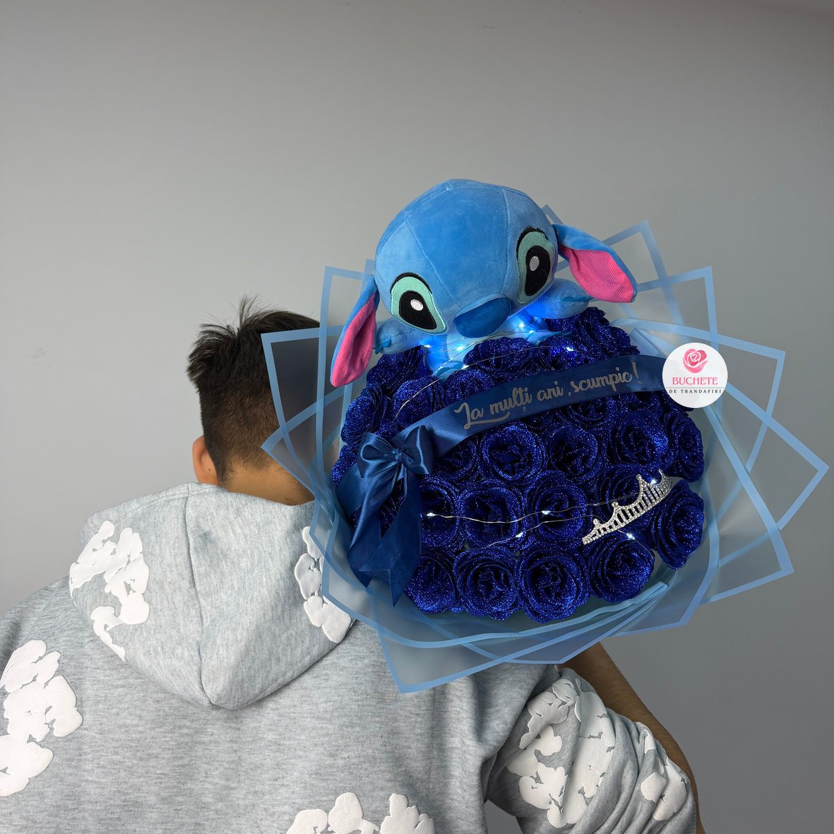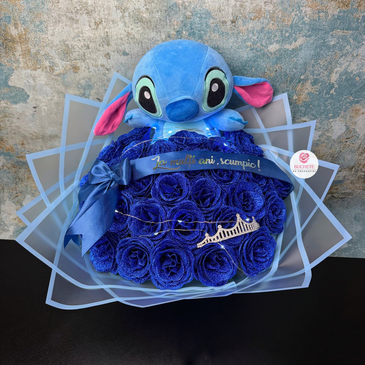 Stitch Buchet de flori, 29 Trandafiri cu sclipici, cadou mesaj si luminite